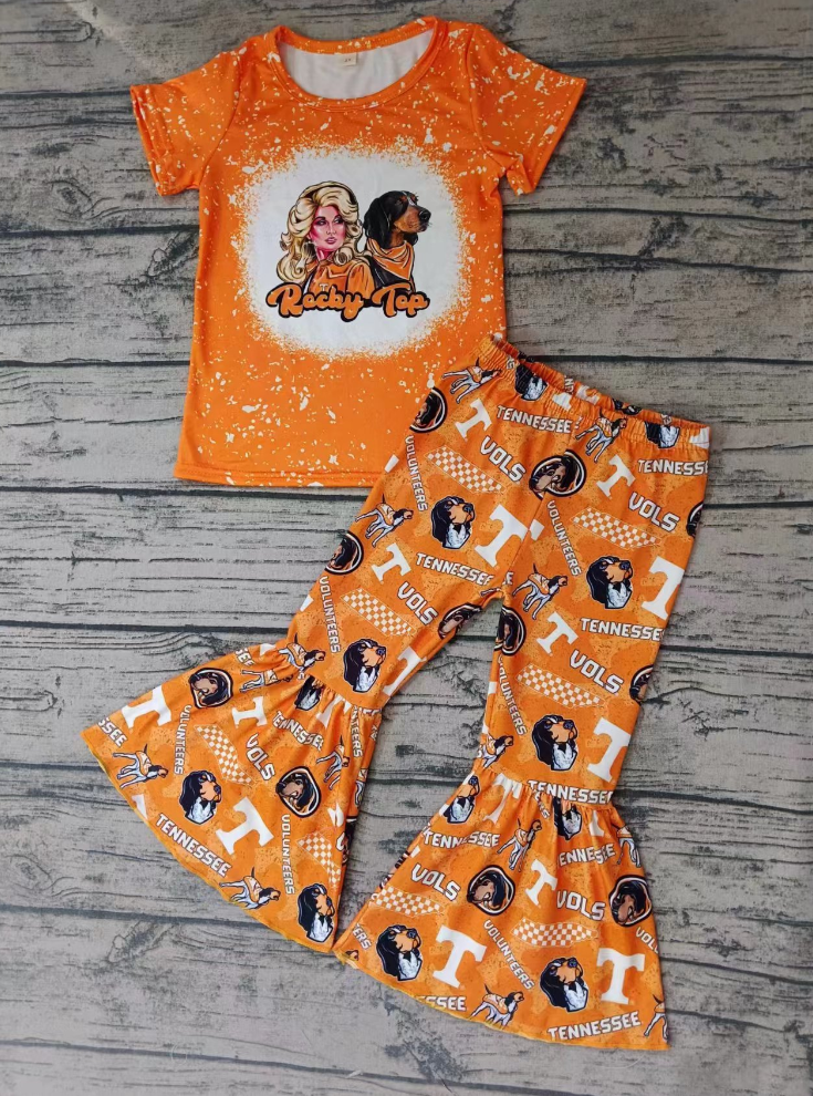 Baby Girl Short Sleeves Dogs Orange Bell Pants Team Outfit Moq 5