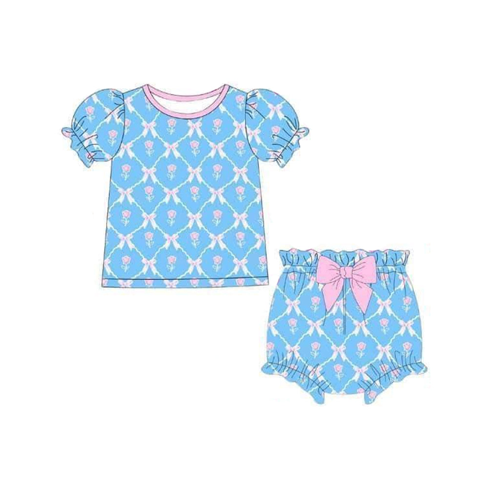Baby Girl Short Sleeves Flower Bows Blue Shirt Bummie Shorts Set RTS