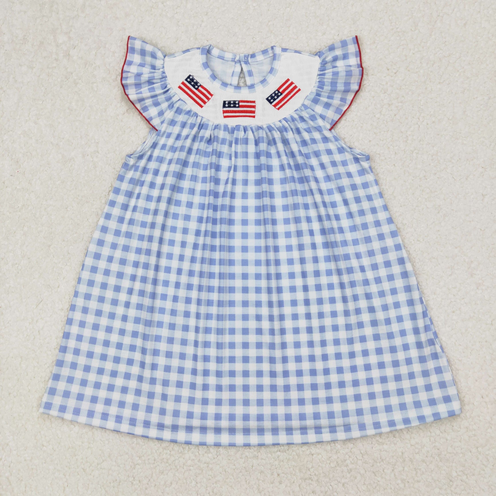 Baby Girl Short Sleeves July 4th Embroidery Flags Blue Checked Smocked Dress RTS