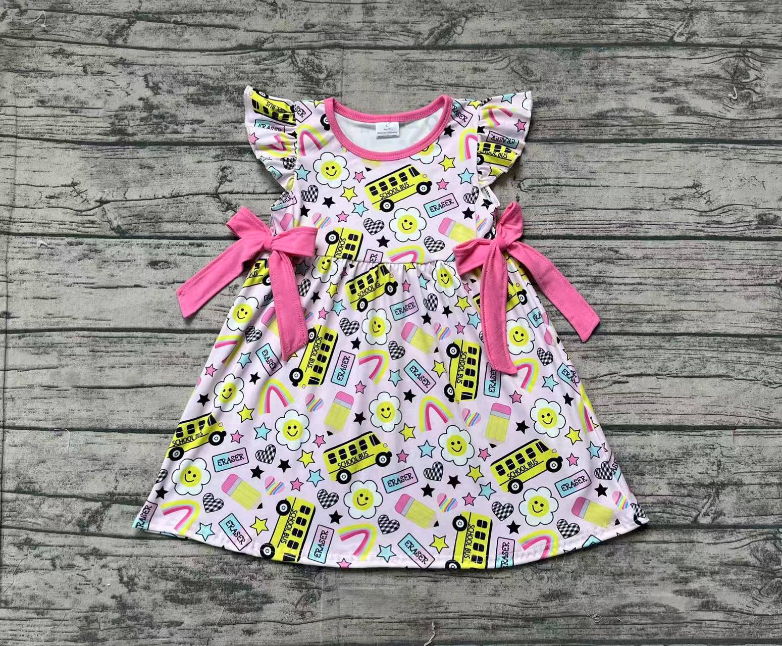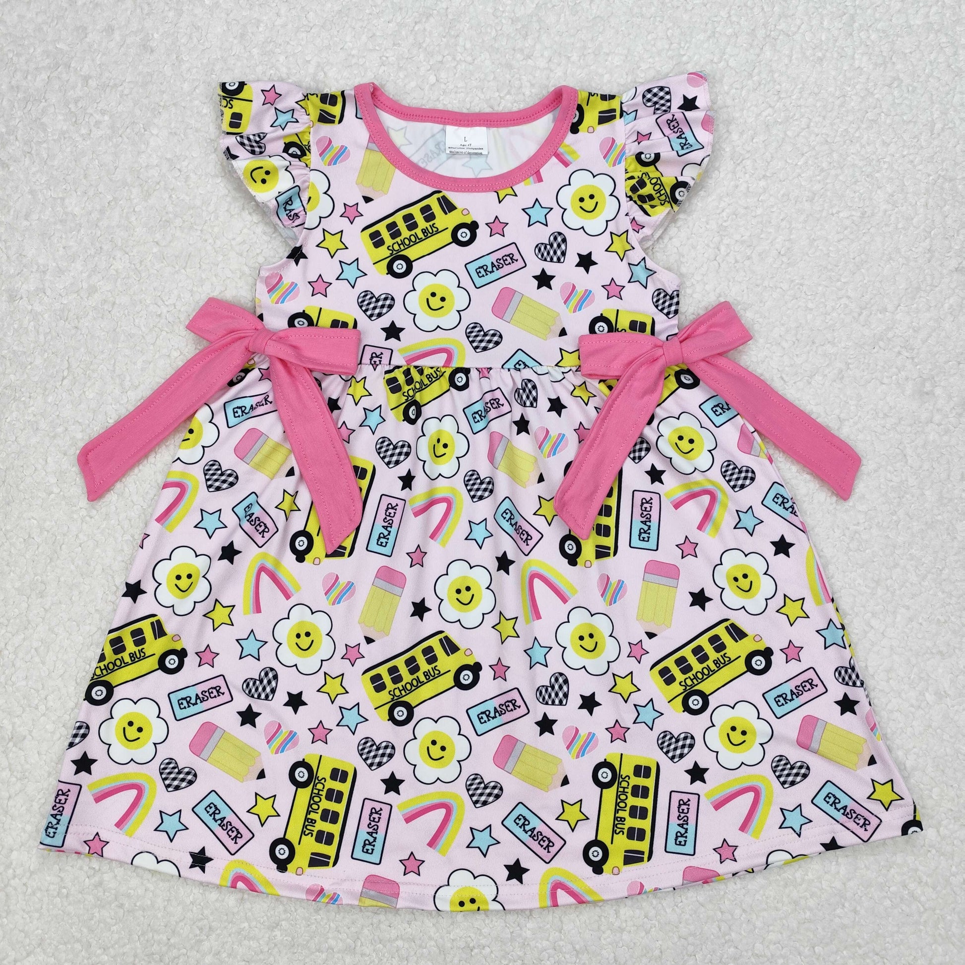 Baby Girl Short Sleeves Pencils Bus Bows Back To School Pink Dress RTS