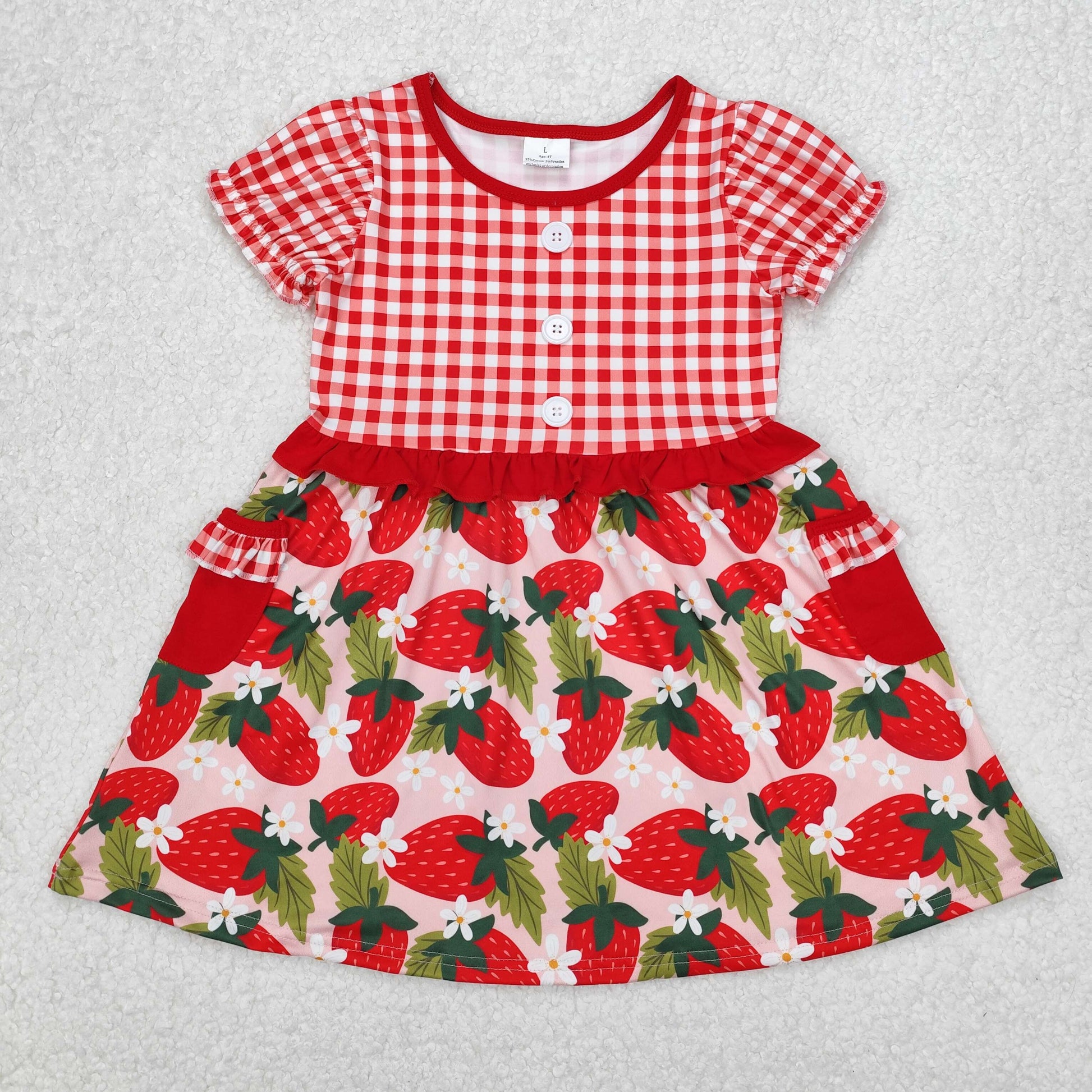 Baby Girl Short Sleeves Red Plaid Strawberry Knee Length Pocket Dress RTS