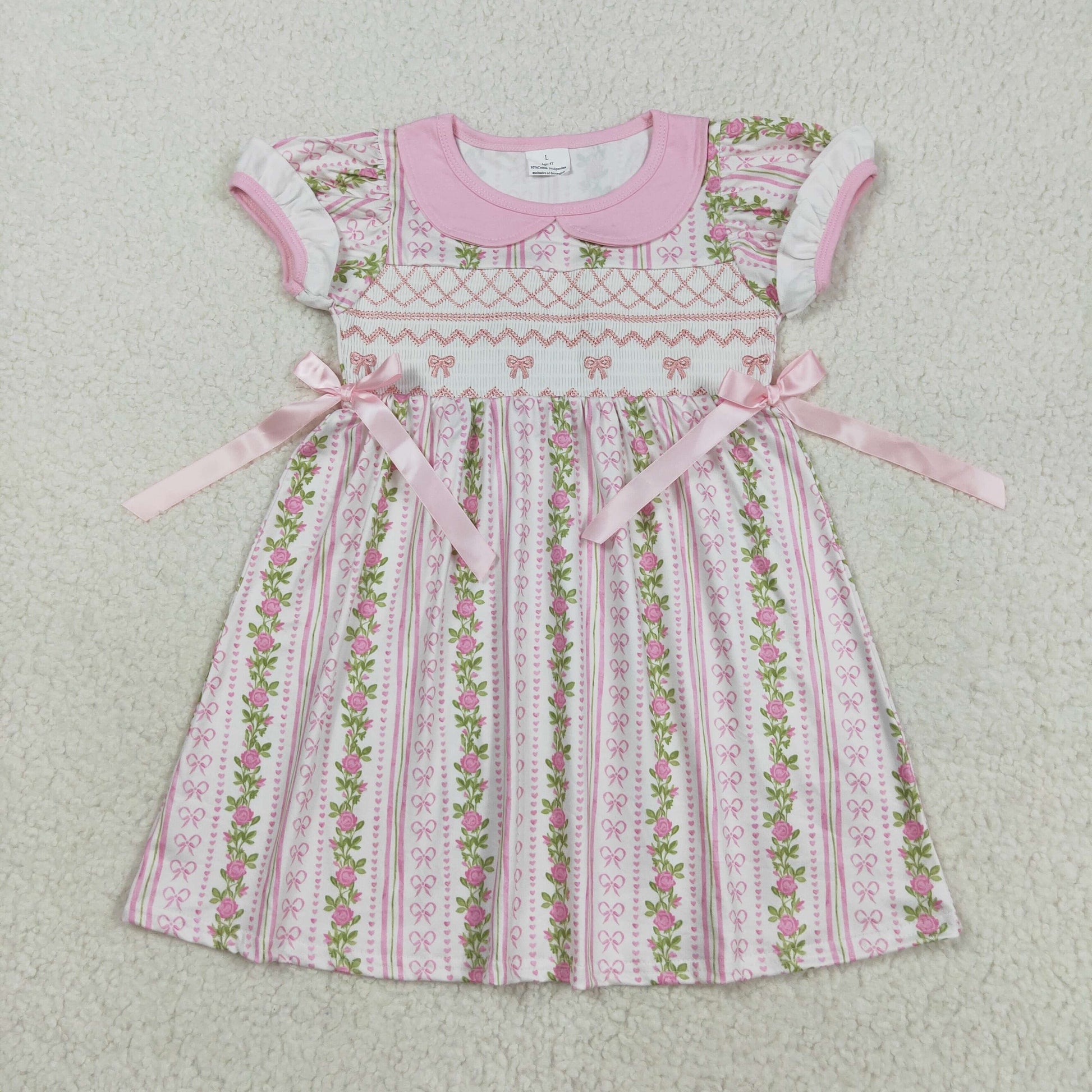 Baby Girl Short Sleeves Smocked Embroidery Flower Bows Pink Summer Knee Length Dress RTS