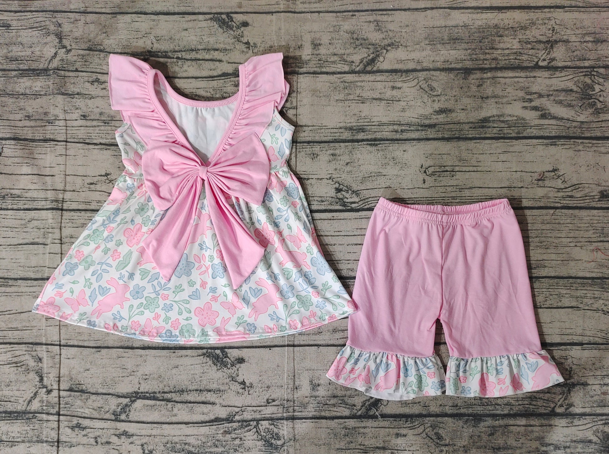 Baby Girl Sleeveless Easter Rabbits Flower Tunic Pink Ruffle Shorts Clothes Set RTS
