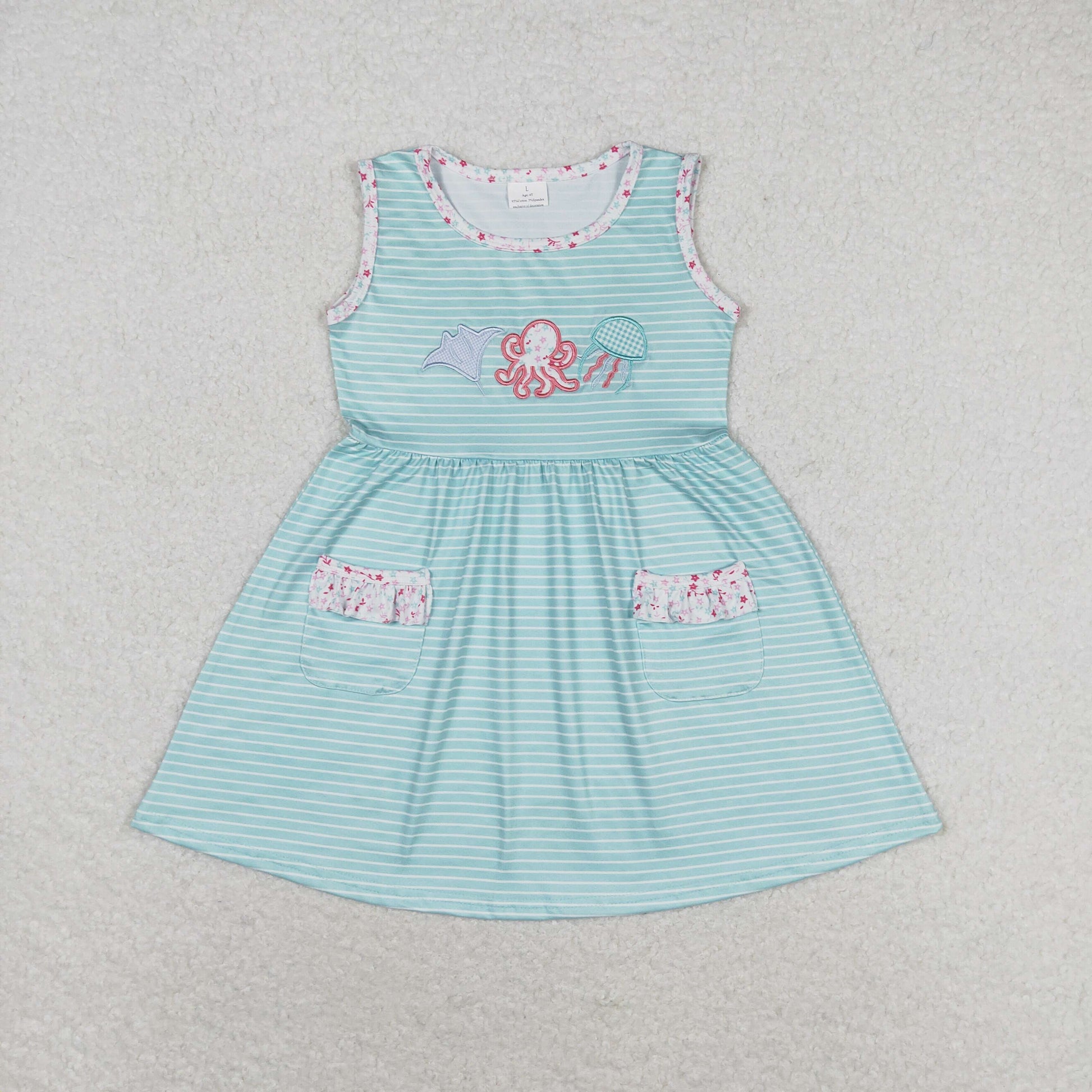 Baby Girl Sleeveless Embroidery 0ctopus Pocket Stripes Dress