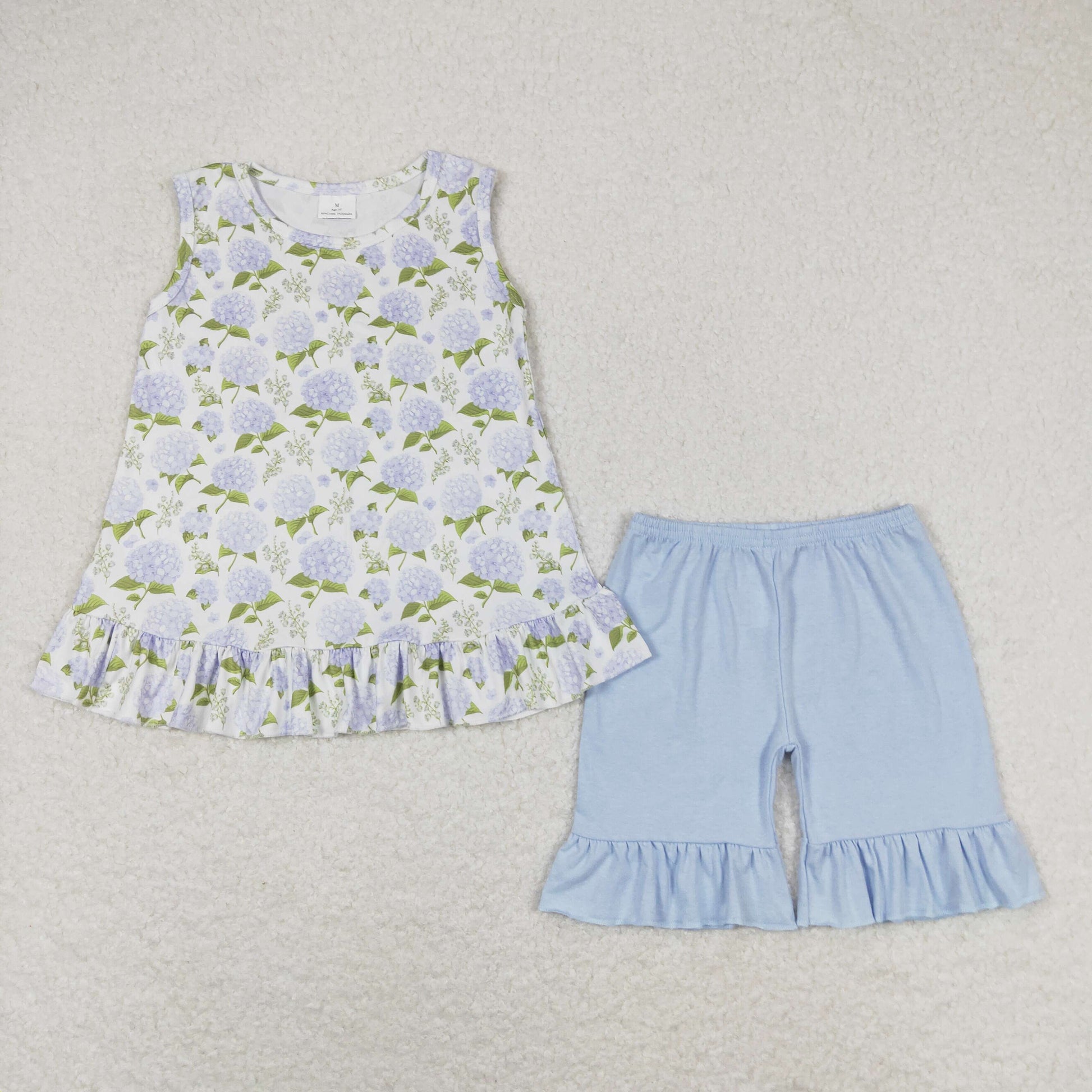 Baby Girl Sleeveless Flower Tops Blue Shorts Summer Set