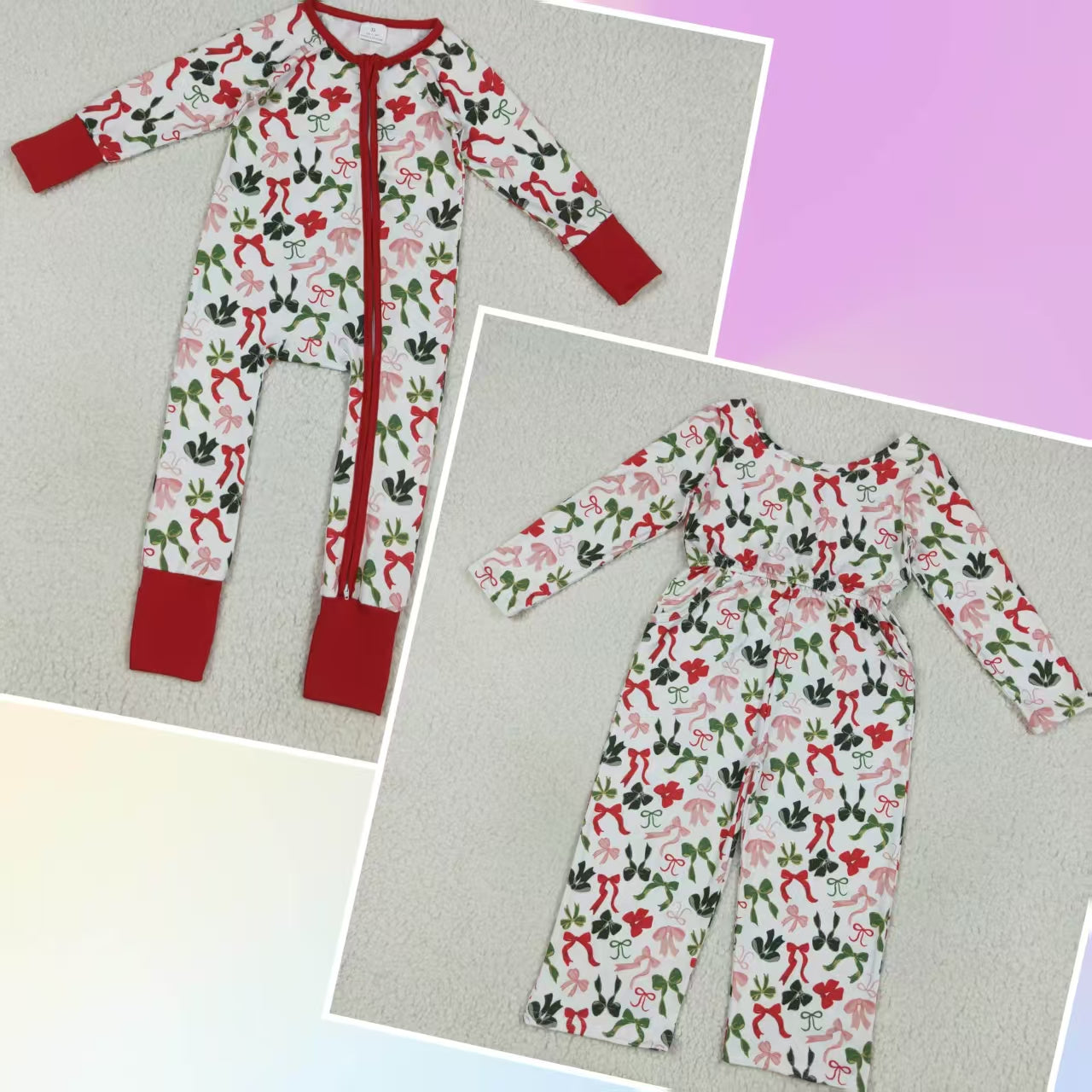 Baby Girl Toddler Long Sleeves Christmas Bows Sibling Zipper Romper Pockets Set RTS