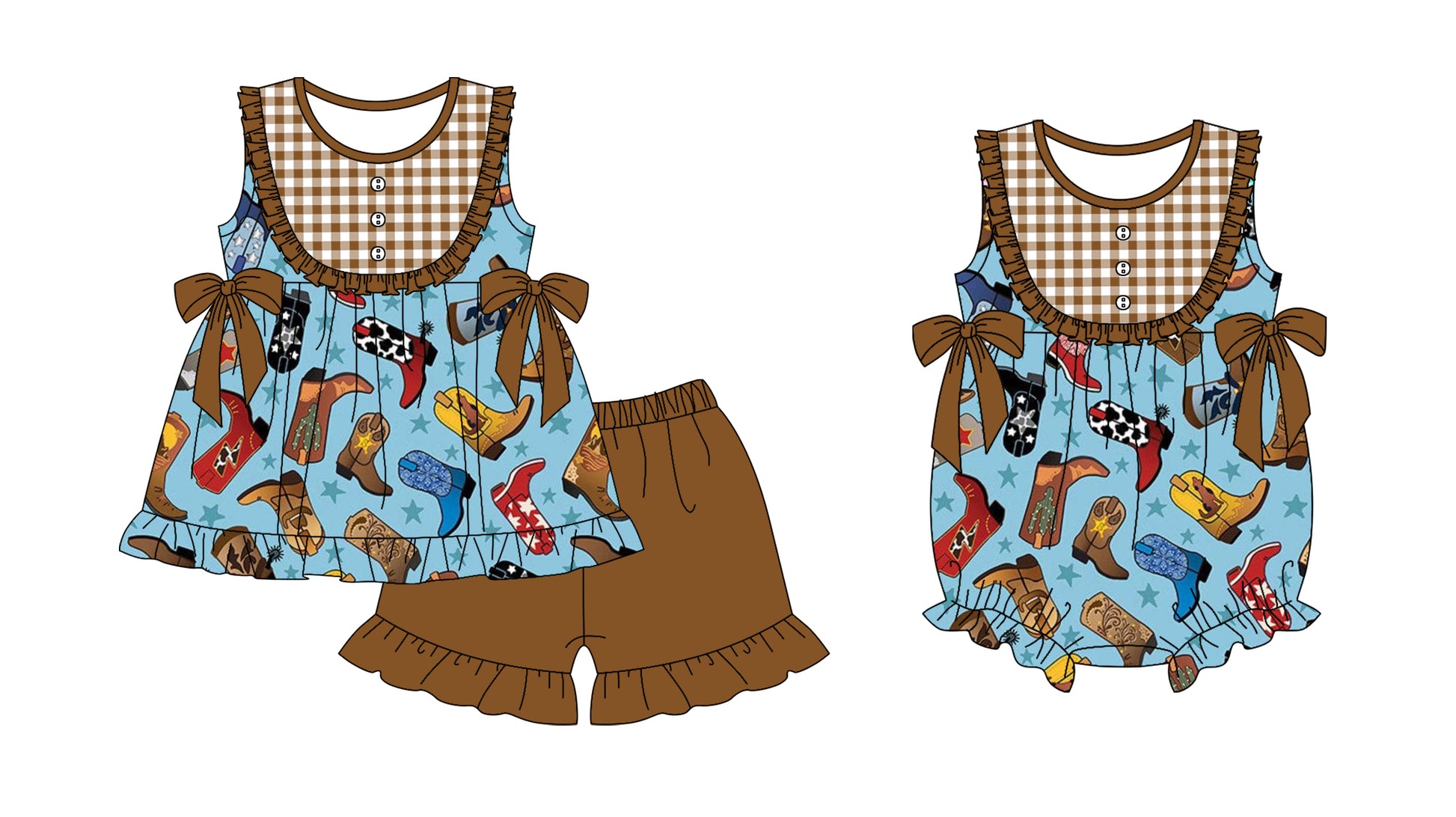 Baby Girl Western Boots Plaid Sibling Romper Clothes Set ( Moq 5 Each Design )11.21