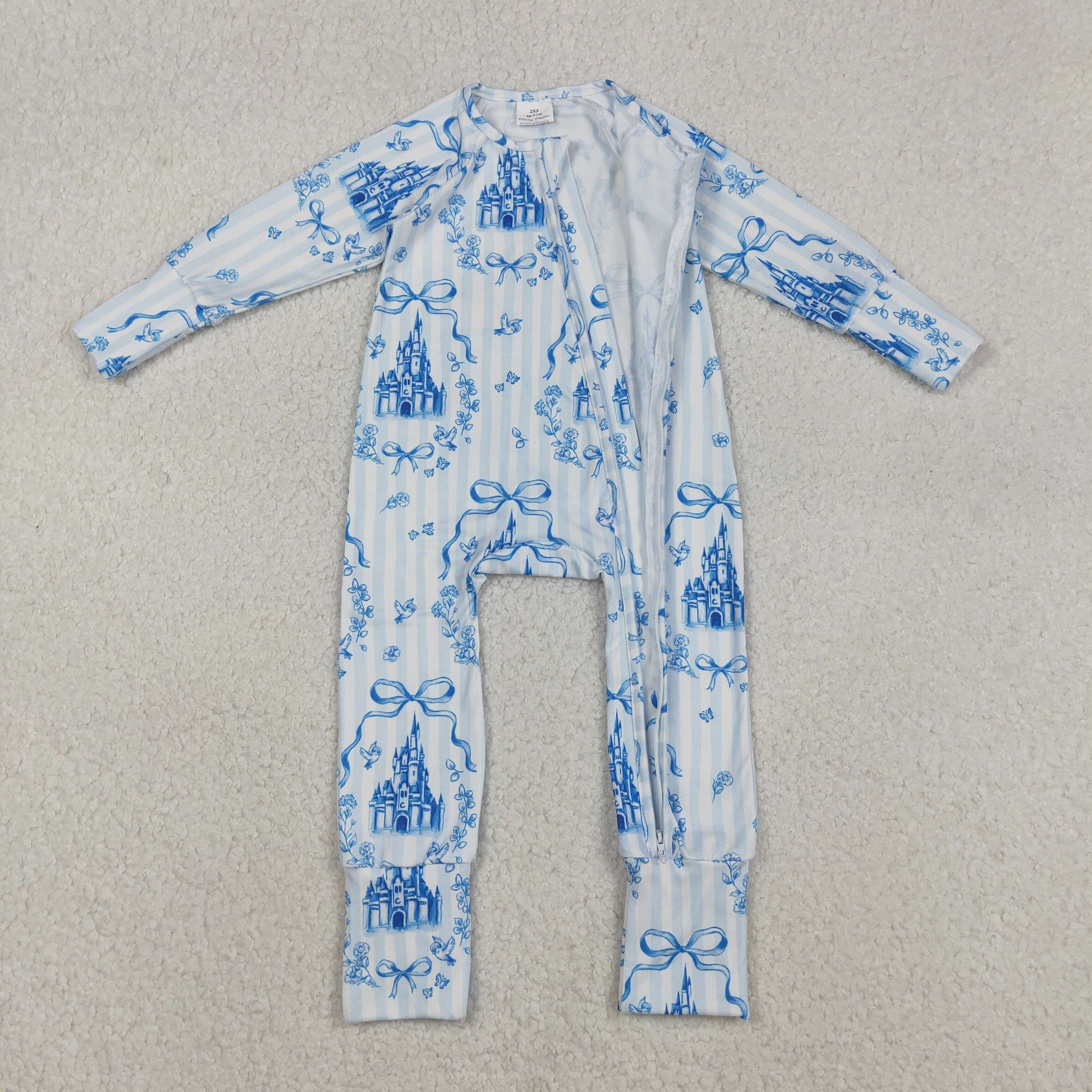Baby Girls Infant Long Sleeves Bows Castle Blue Zipper Sleeper Romper RTS