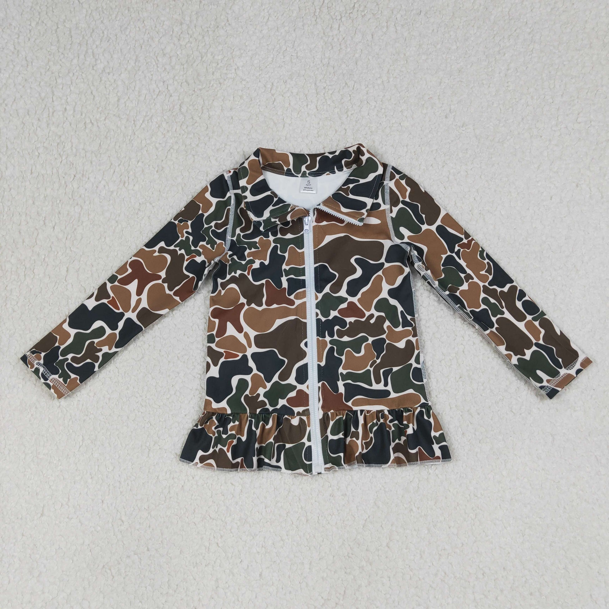 Baby Girls Kids Long Sleeves Brown Camo Zipper Ruffle Cardigan Shirt Tops RTS