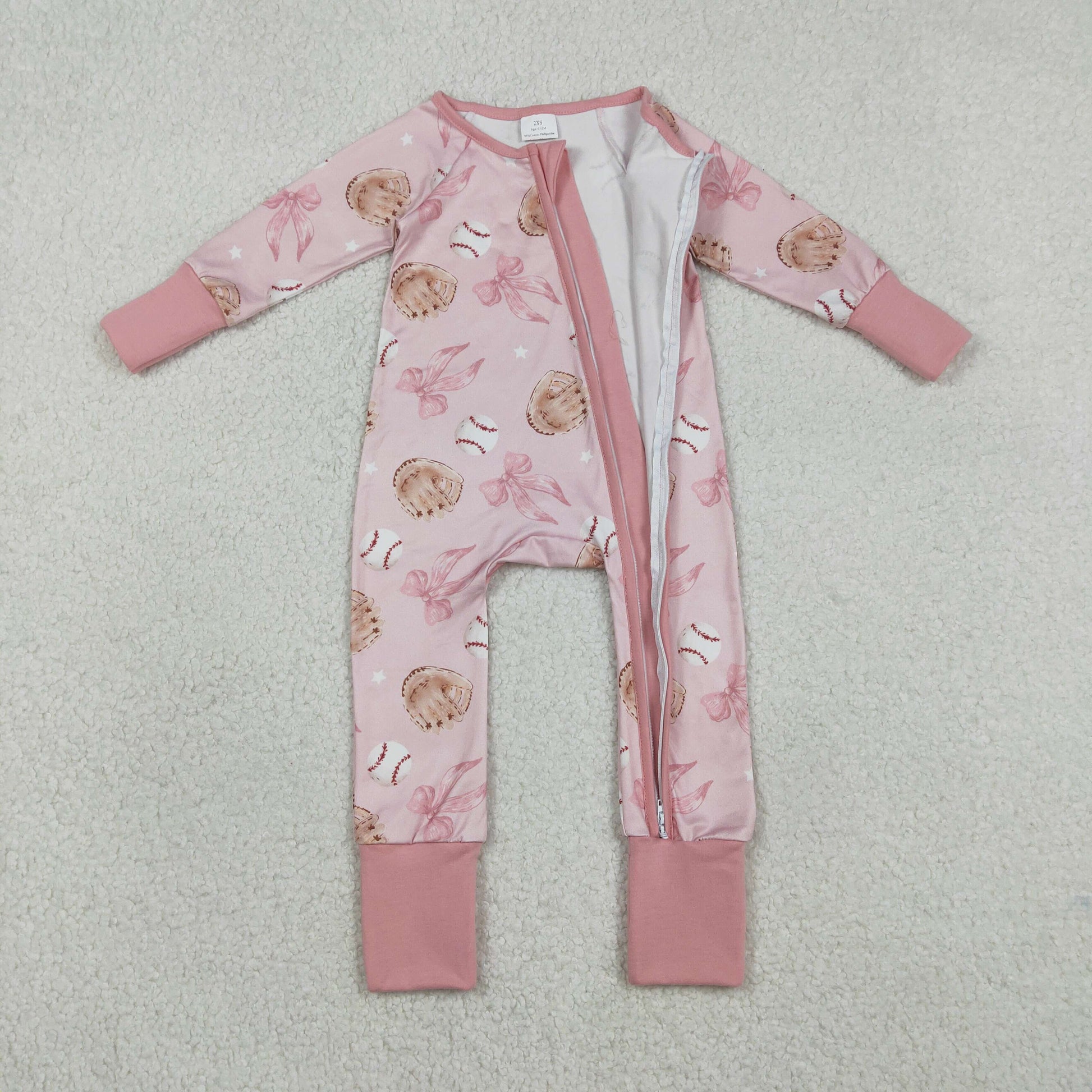 Baby Girls Long Sleeves Baseballs Bows Zipper Sleeper Pink Romper RTS