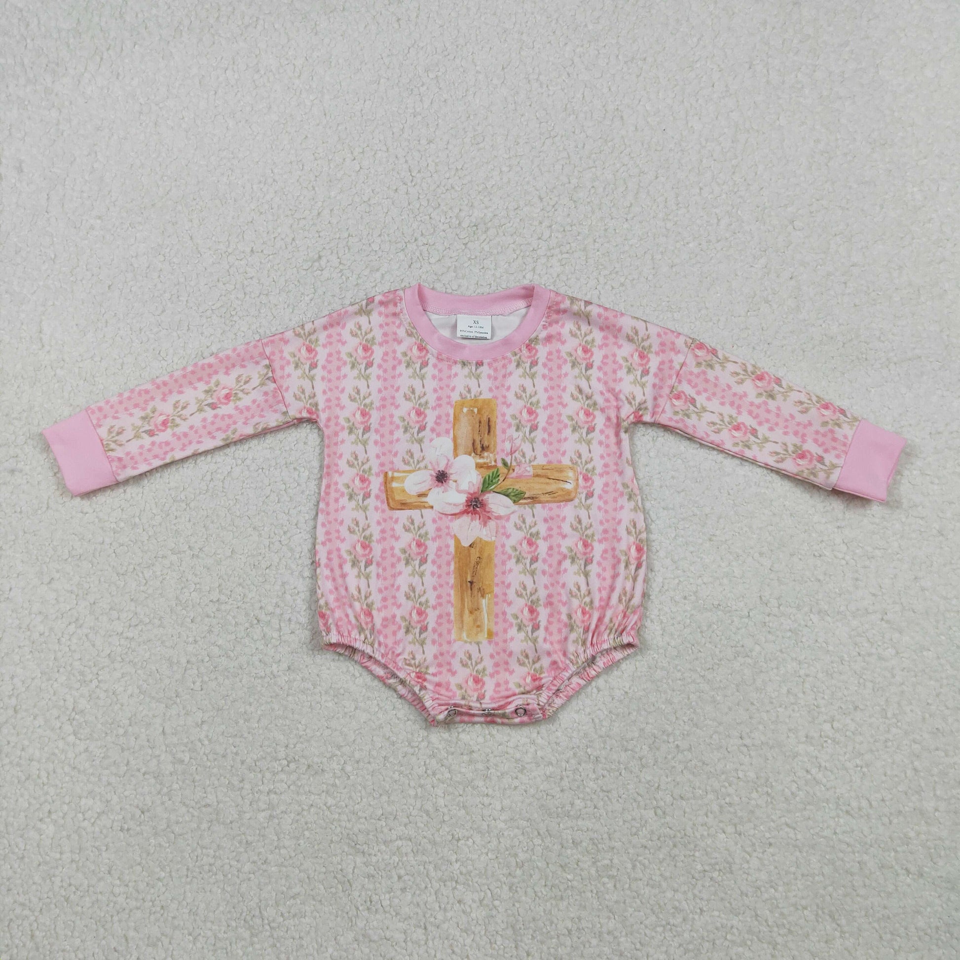 Baby Girls Long Sleeves Cross Flower Easter Bubble Pink Romper RTS