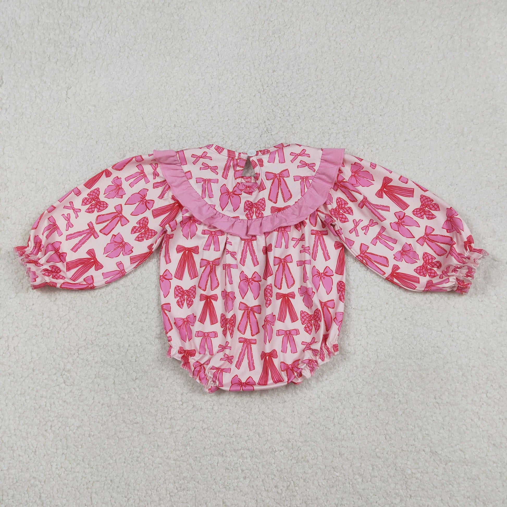 Baby Girls Long Sleeves Embroidery Smocked Daddy's Valentine Pink Bows Bubble Romper