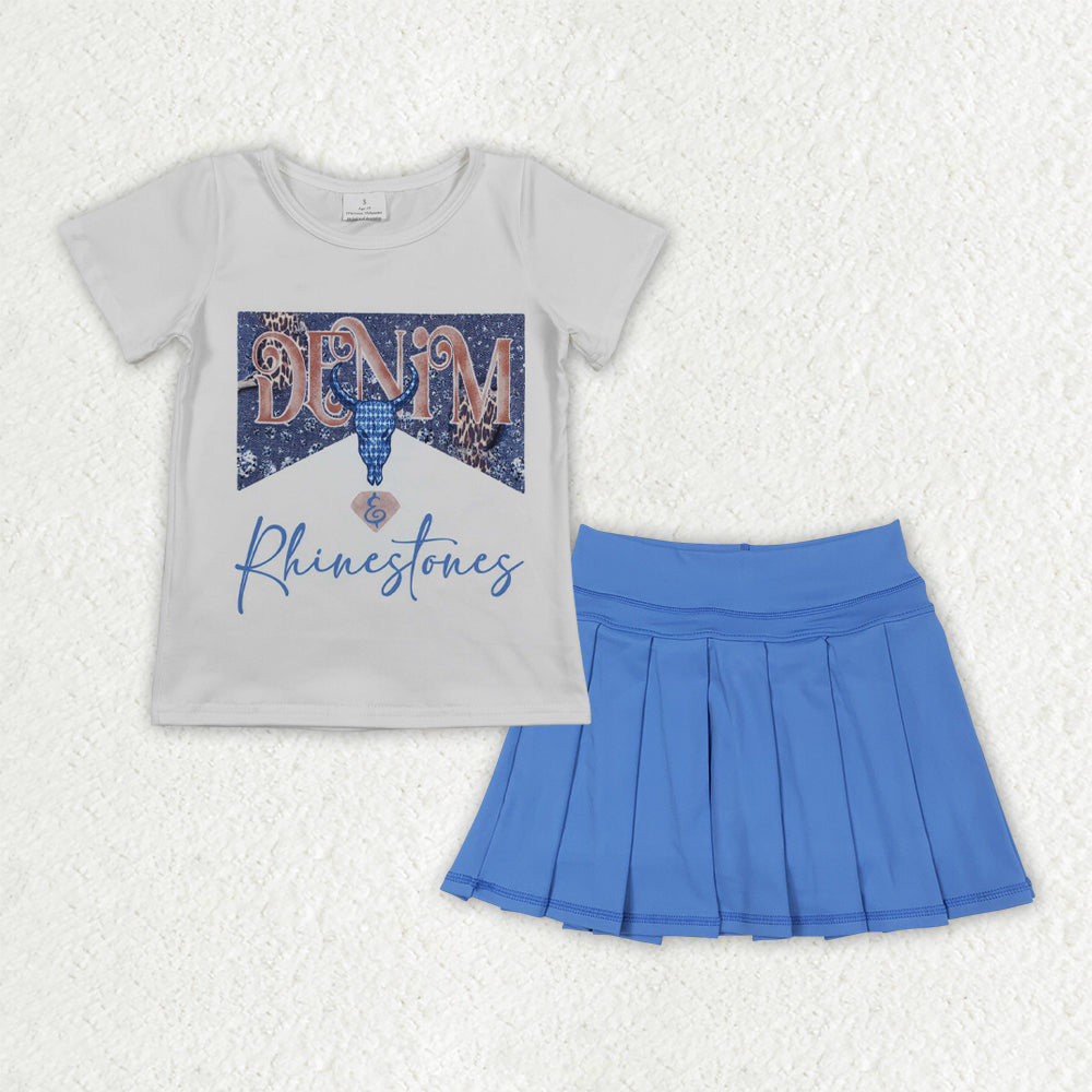 Baby Girl Short Sleeves Western Cow Shirt Blue Pleated Skort Yoga Active Set
