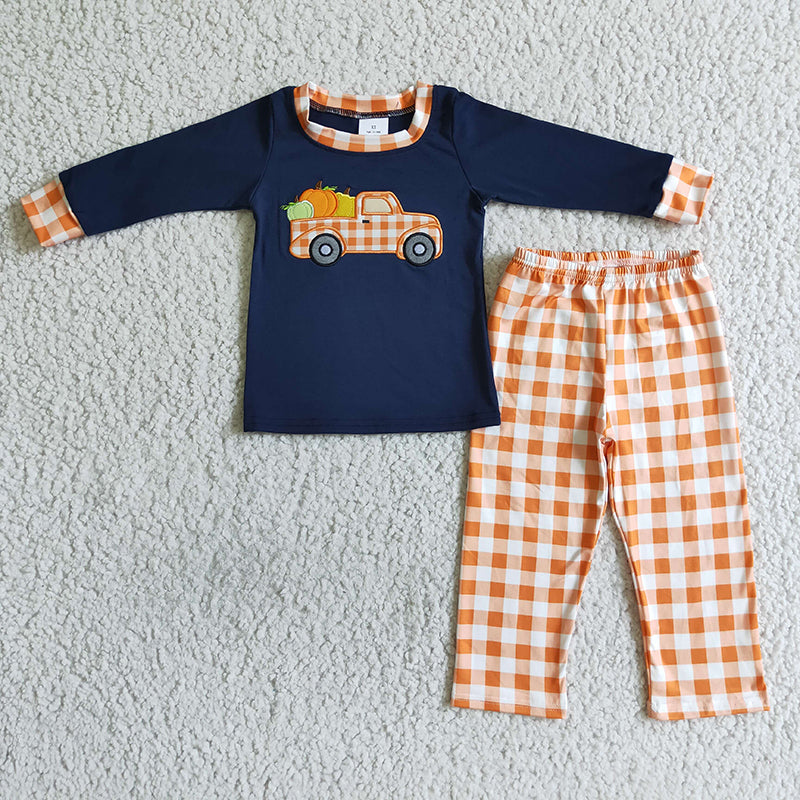 BLP0002 Boy Boy Thanksgiving Embroidery Pumpkin Plaid Pants Outfit