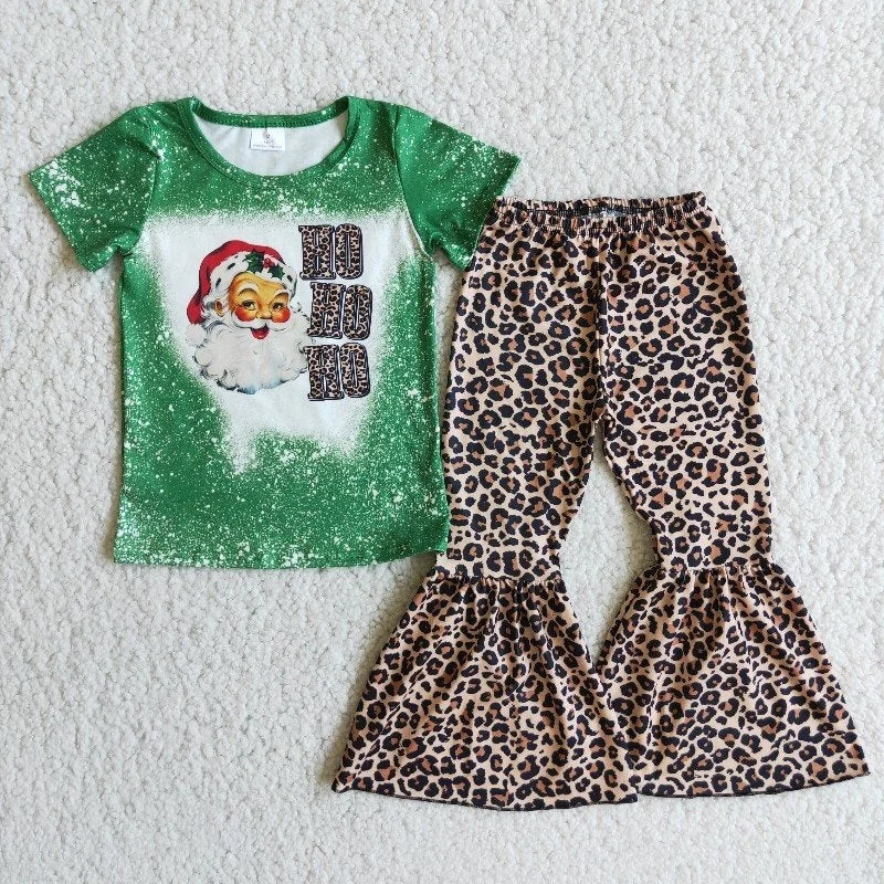 D1-5 Christmas Santa Baby Girl Green Ho Ho Ho Leopard Bell Pants Set