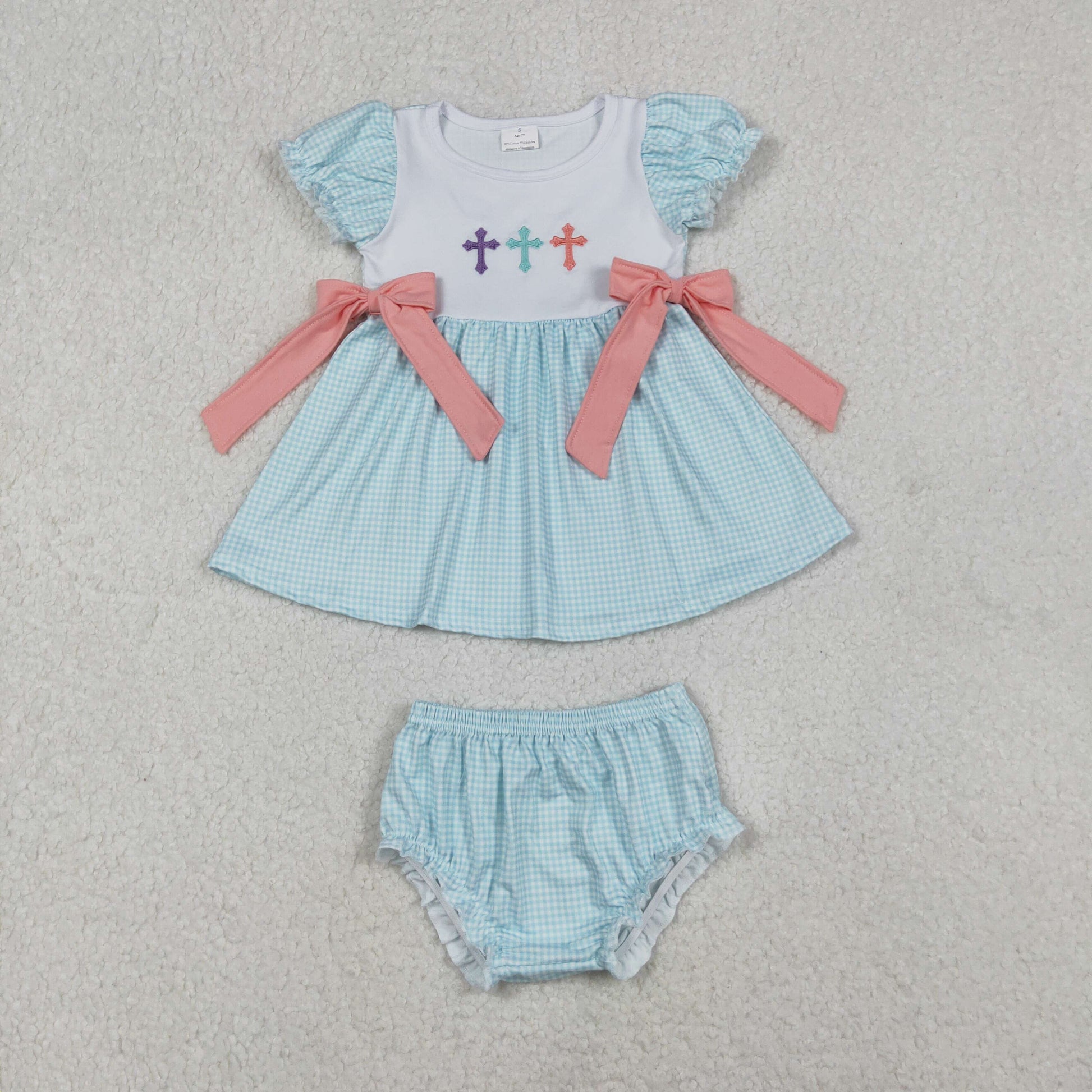 Sibling Baby Girls Kids Embroidery Cross Easter Blue Plaid Easter Dress Set RTS