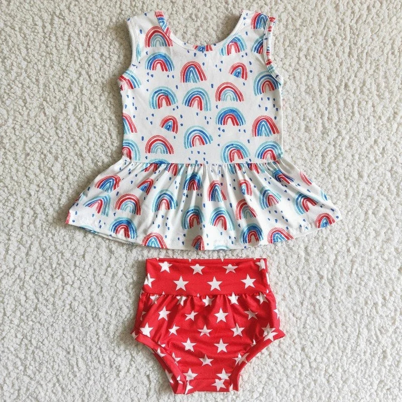 GBO0014 Baby Girl July 4th Rainbow Stars Bummies Summer Outfit