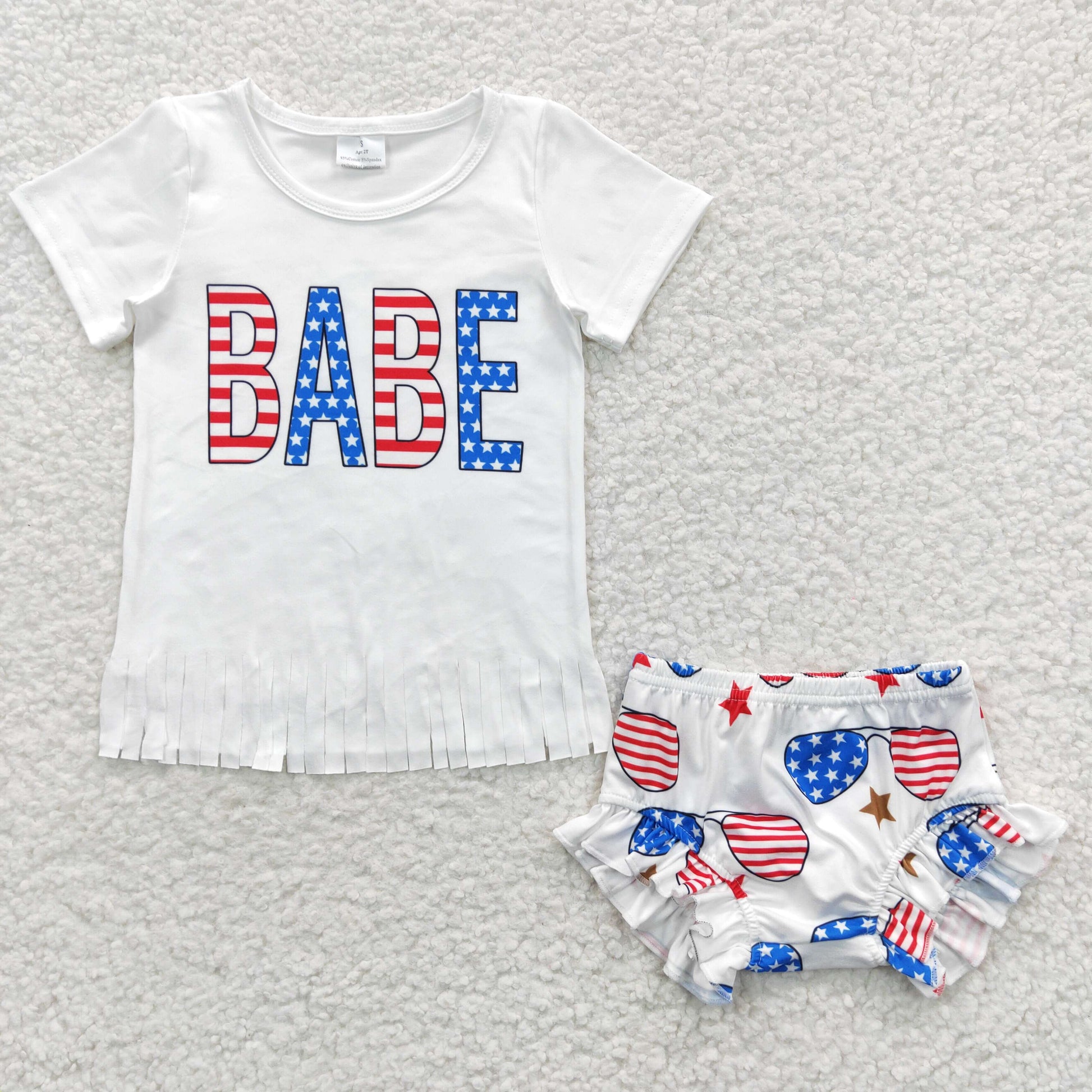 GBO0127 Baby Girl July 4th Short Sleeves Tassel Shirt Star Bummie Summer Outfit
