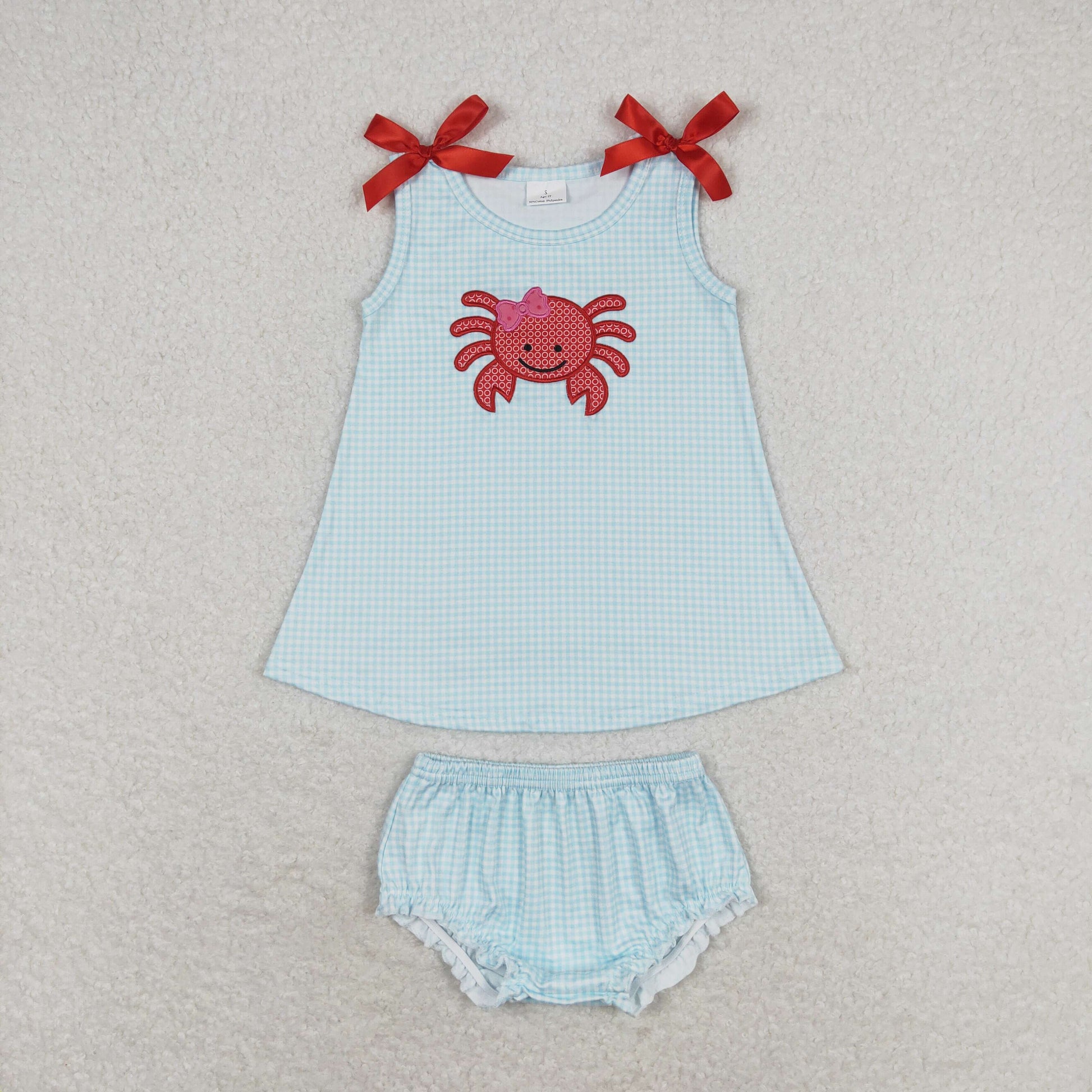 Baby Girls Embroidery Crab Blue Plaid Tops Bummie Shorts Set