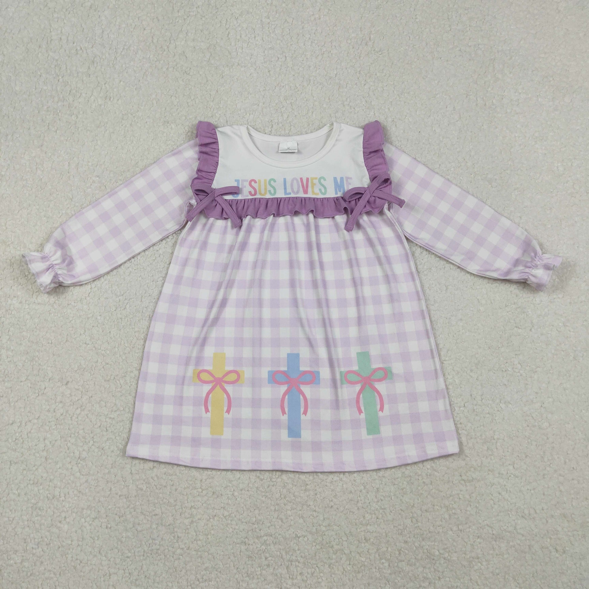 Girls Kids Long Sleeves Jesus Loves Me Purple Plaid Cross Easter Dress RTS
