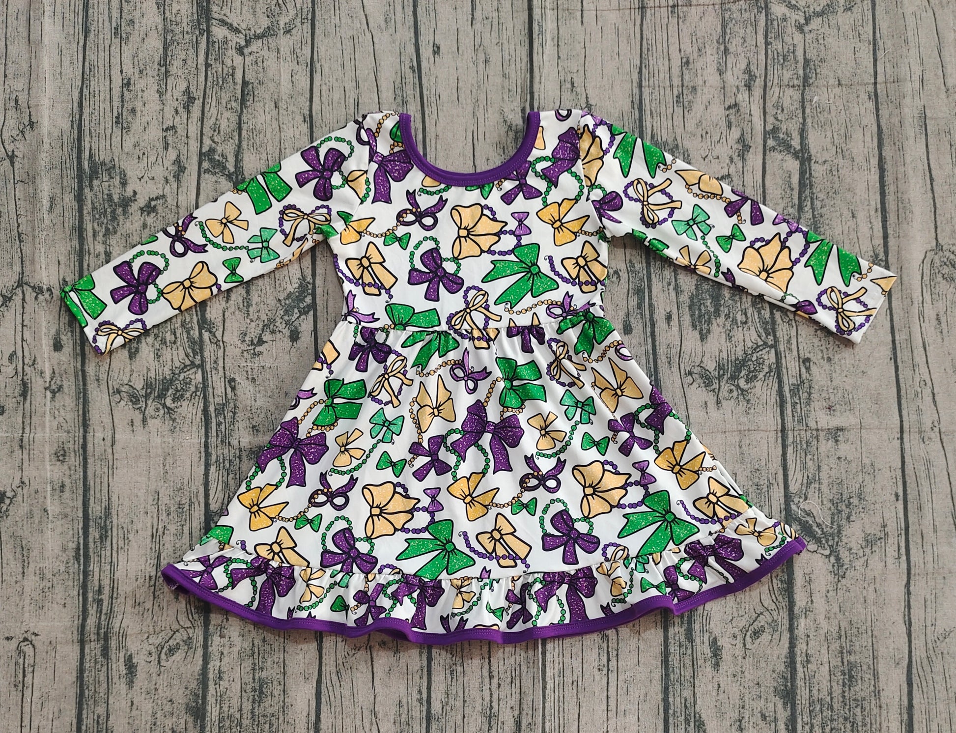 Girls Kids Long Sleeves Mardi Gras Bows Ruffle Knee Length Dress RTS