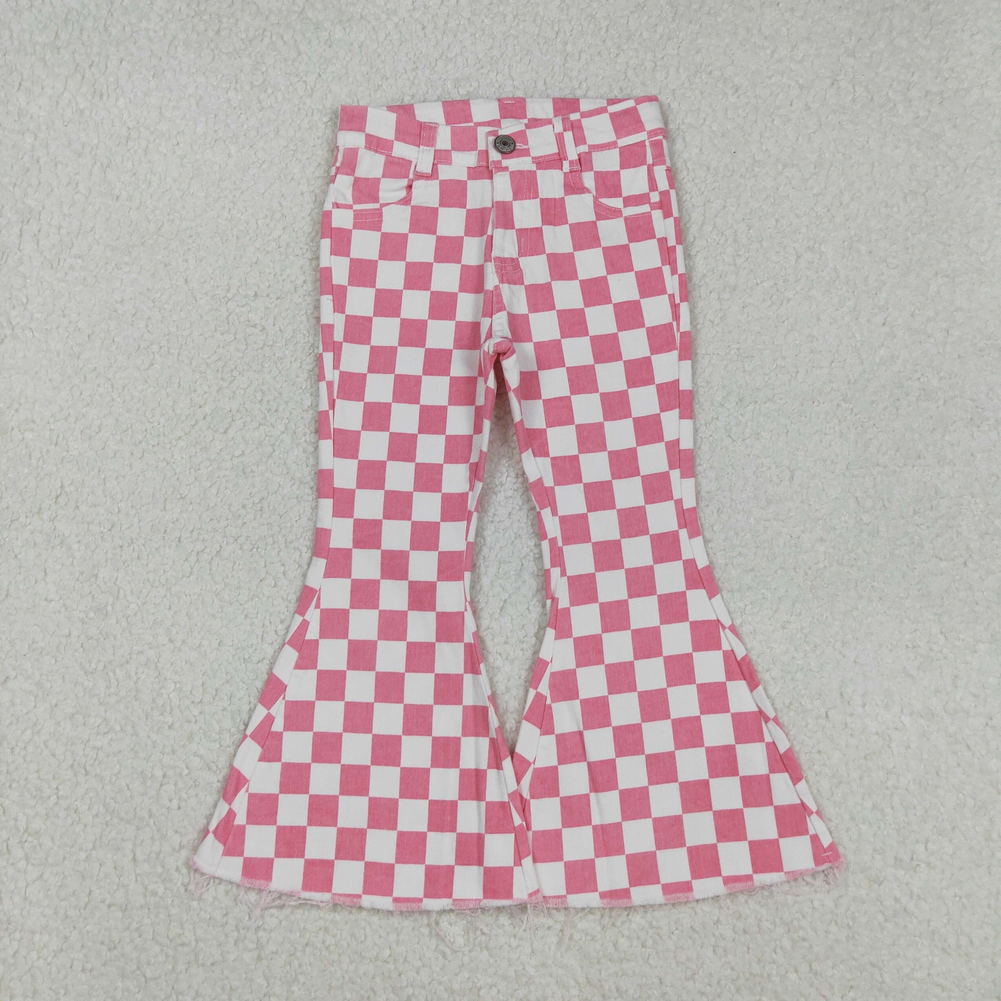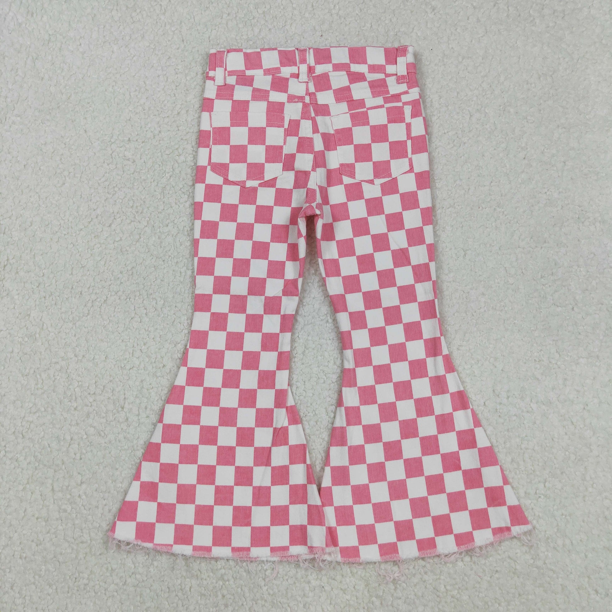 Girls Kids Pink Checkered Denim Jeans Bell Pants RTS