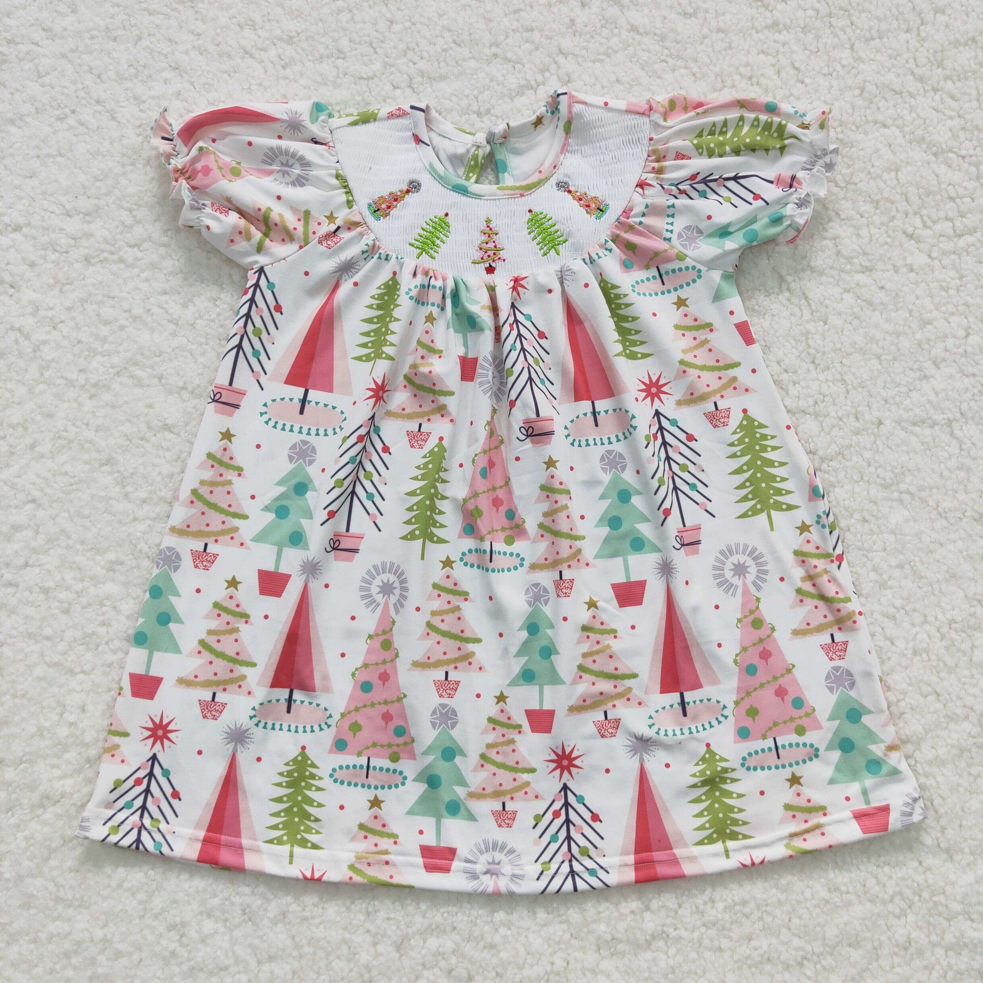 Girls Kids Short Sleeves Smocked Embroidery Trees Christmas Knee Length Dress RTS