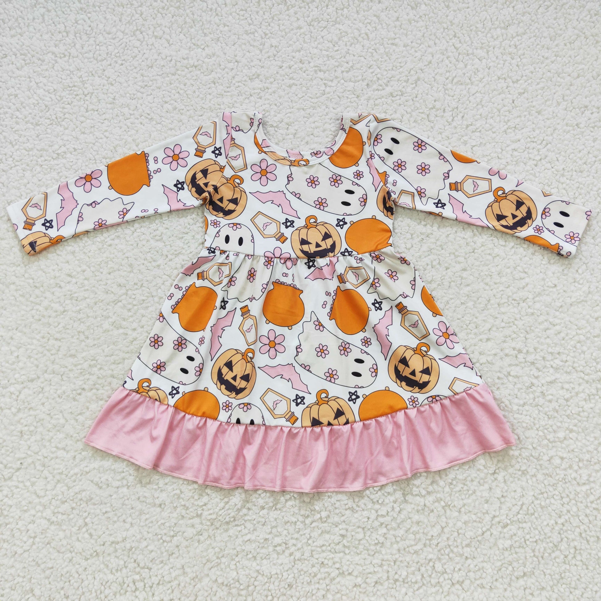 GLD0244 Baby Girl Long Sleeves Halloween Ghost Pumpkin Floral Dress