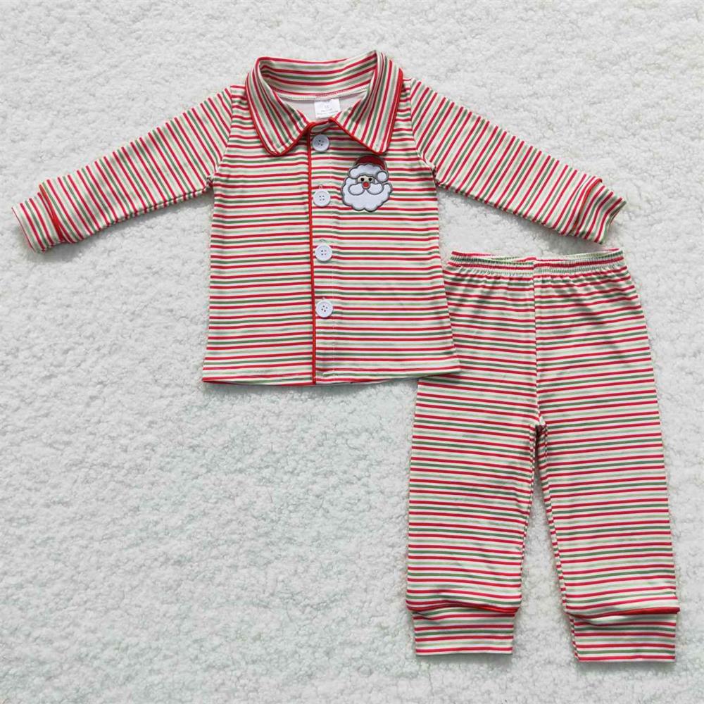 GLP0550 Christmas Embroidery Santa Baby Girl Long Sleeves Button Up Cardigan Pants Striped Outfit Pajamas