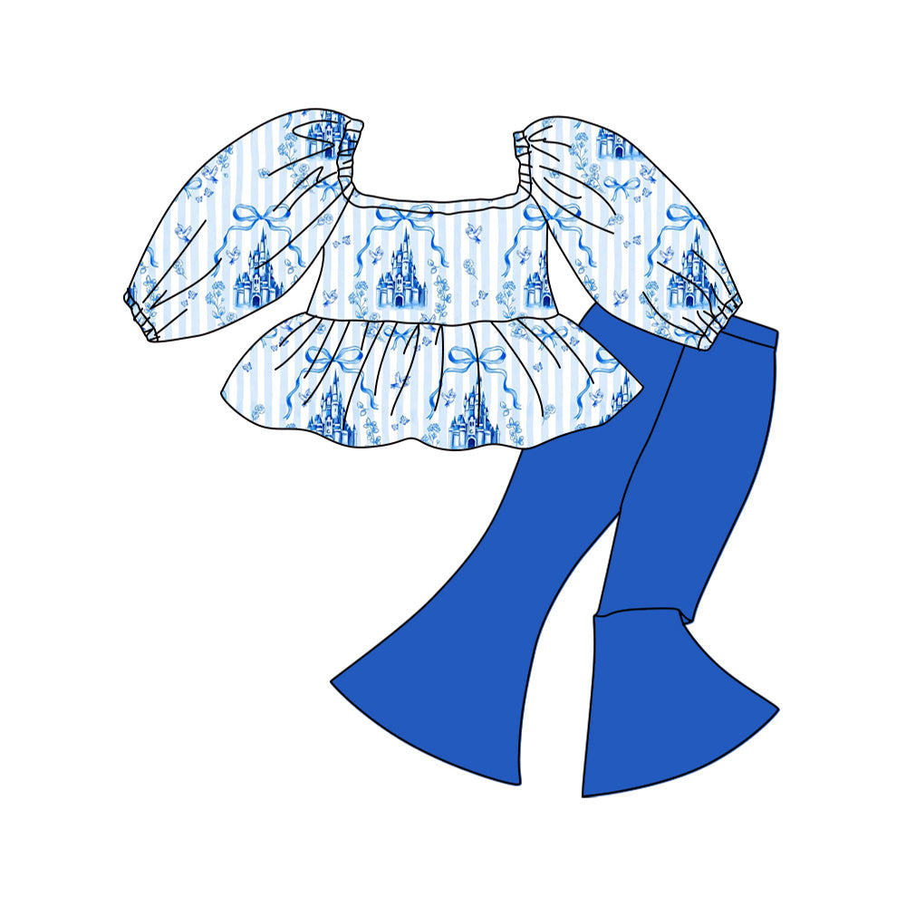 ( Moq 5 ) Preorder Baby Girls Kids Long Sleeves Castles Bows Stripes Tunic Blue Pants Clothes Set