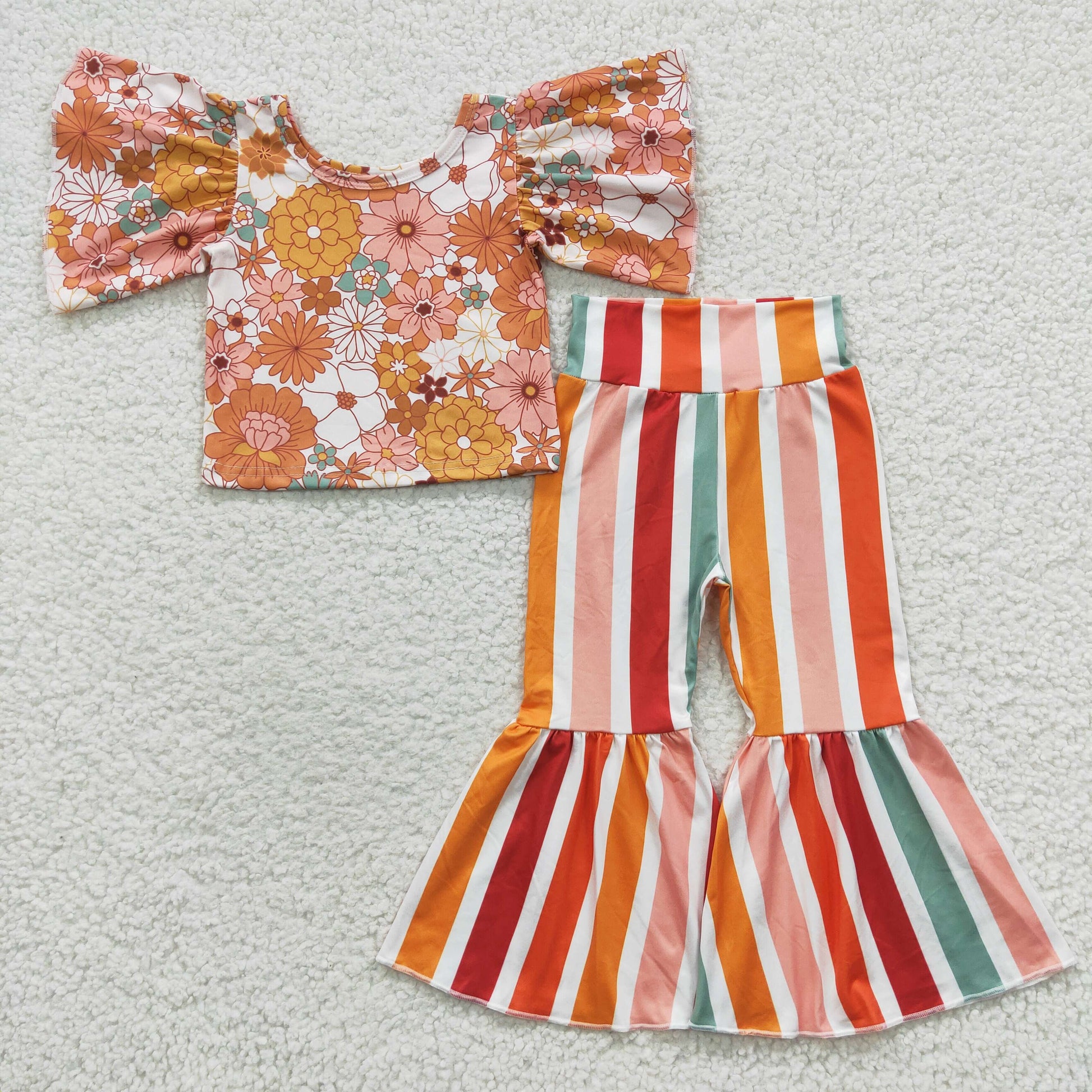 GSPO0724 Baby Girl Floral Tops Striped Bell Pants Outfit