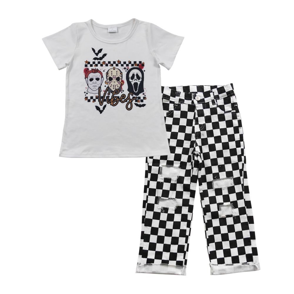 Halloween Baby Boy Short Sleeves Shirt Checkered Denim Pants Jeans Outfit