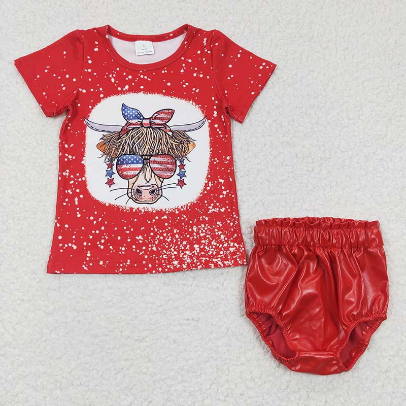 July 4th Western Cow Baby Girl Short Sleeves Shirt Red Leather Bummie Summer Outfit