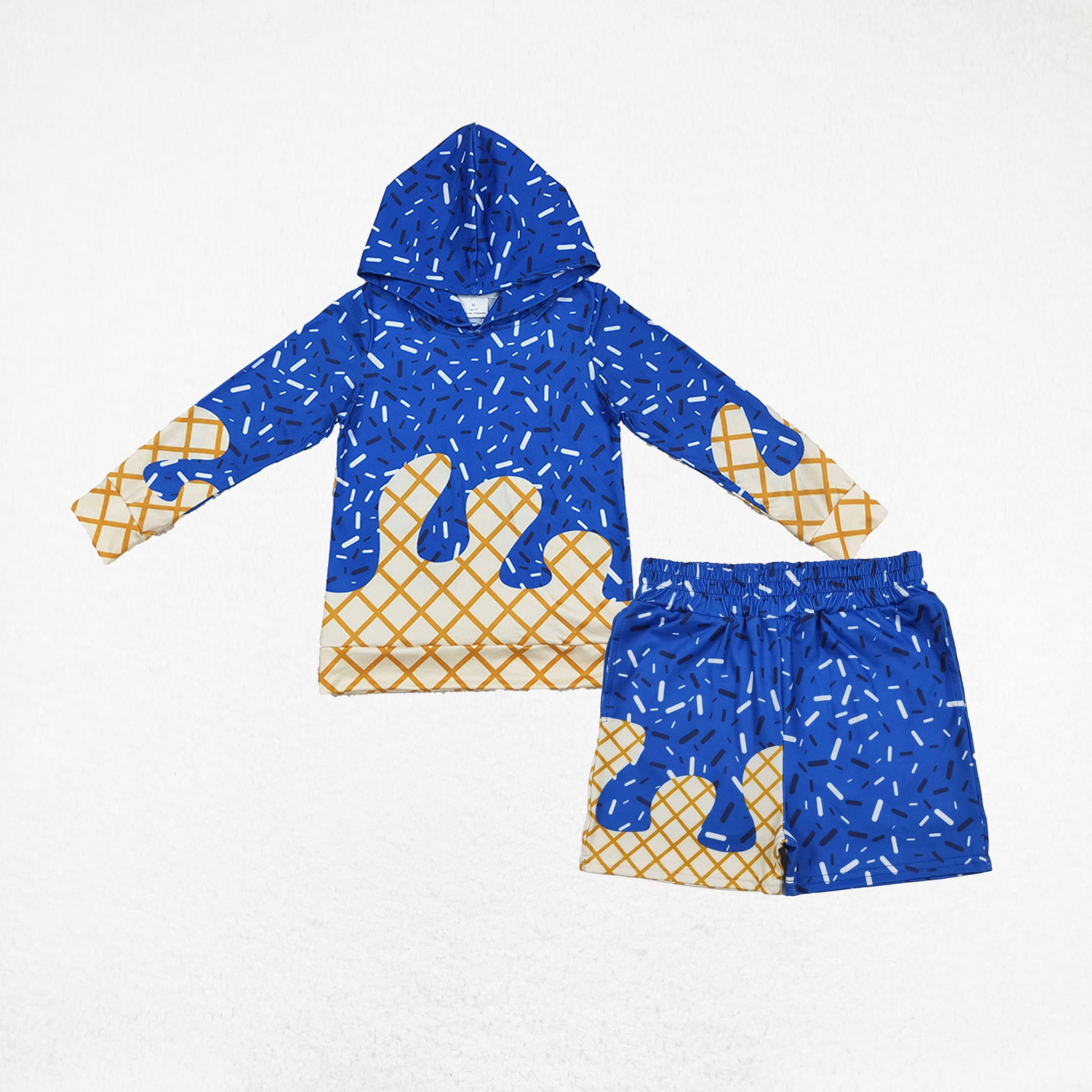 Kids Boys Long Sleeves Blue Drips Hoodie Team Shirt Pockets Shorts Set RTS