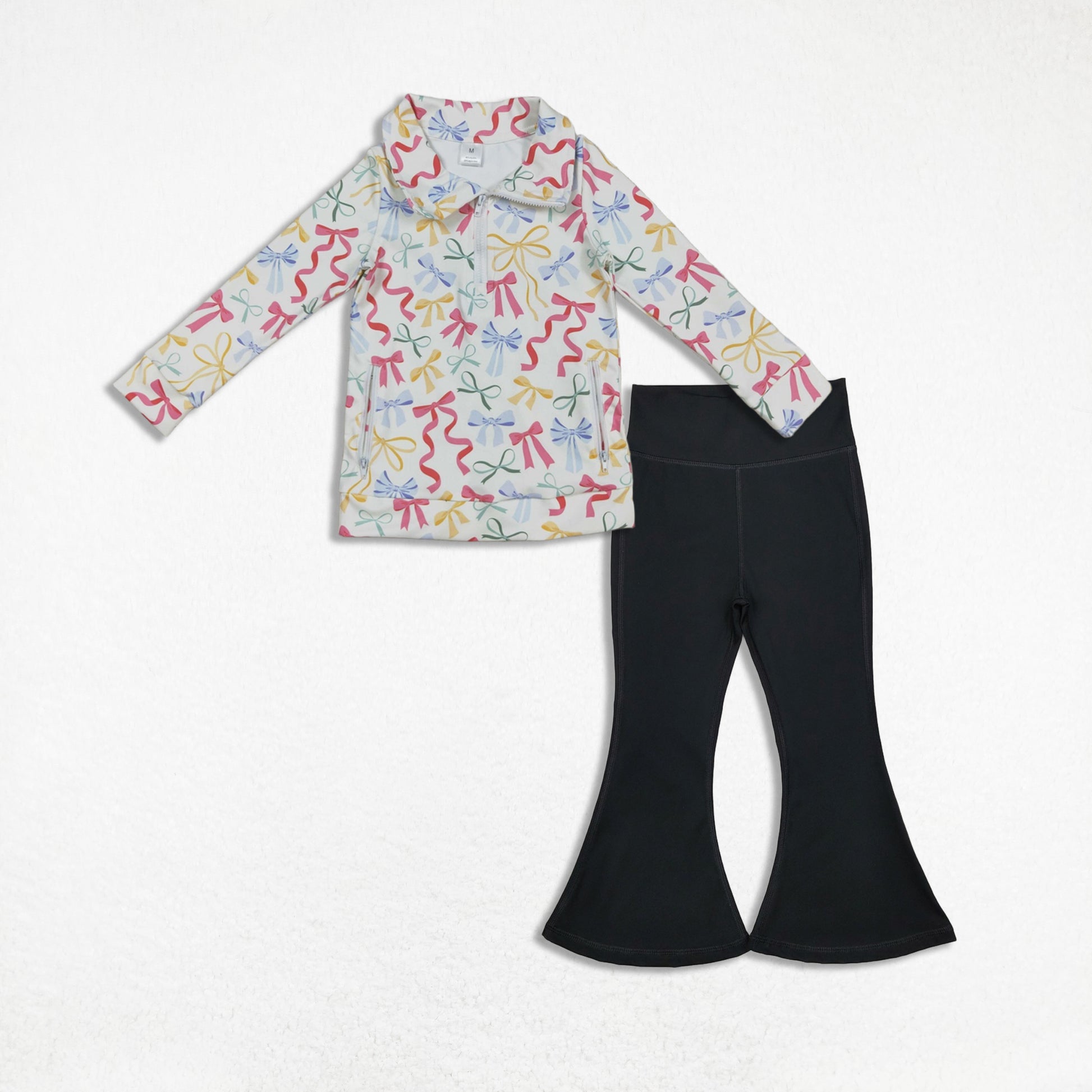Kids Girls Long Sleeves Bows Zipper Pockets Cardigan Black Pants Yoga Active Set RTS