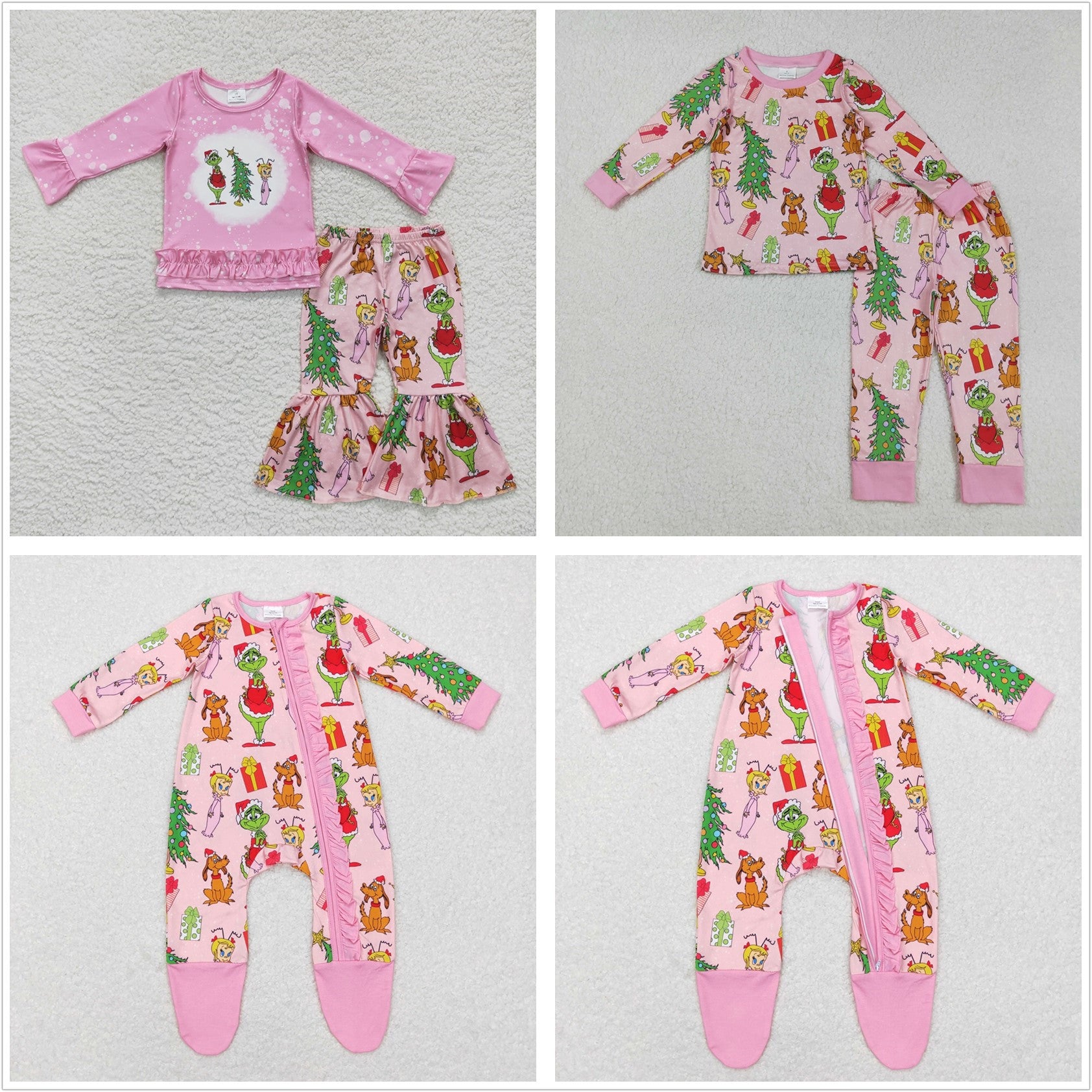 Kids Girls Long Sleeves Green Face Christmas Sibling Pajamas Footie Romper Set Pink Clothes RTS