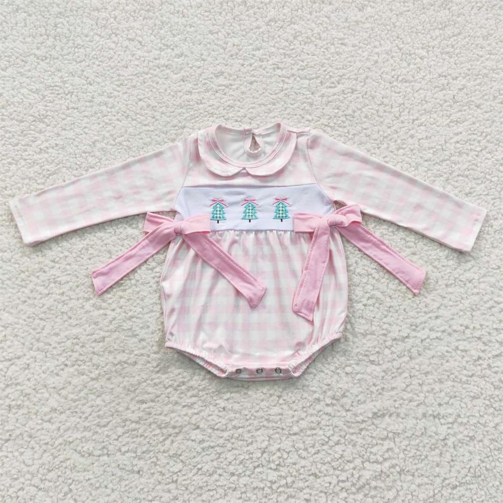 LR0335 Baby Boy Newborn Long Sleeves One Piece Embroidery Christmas Tree Blue Plaid Romper