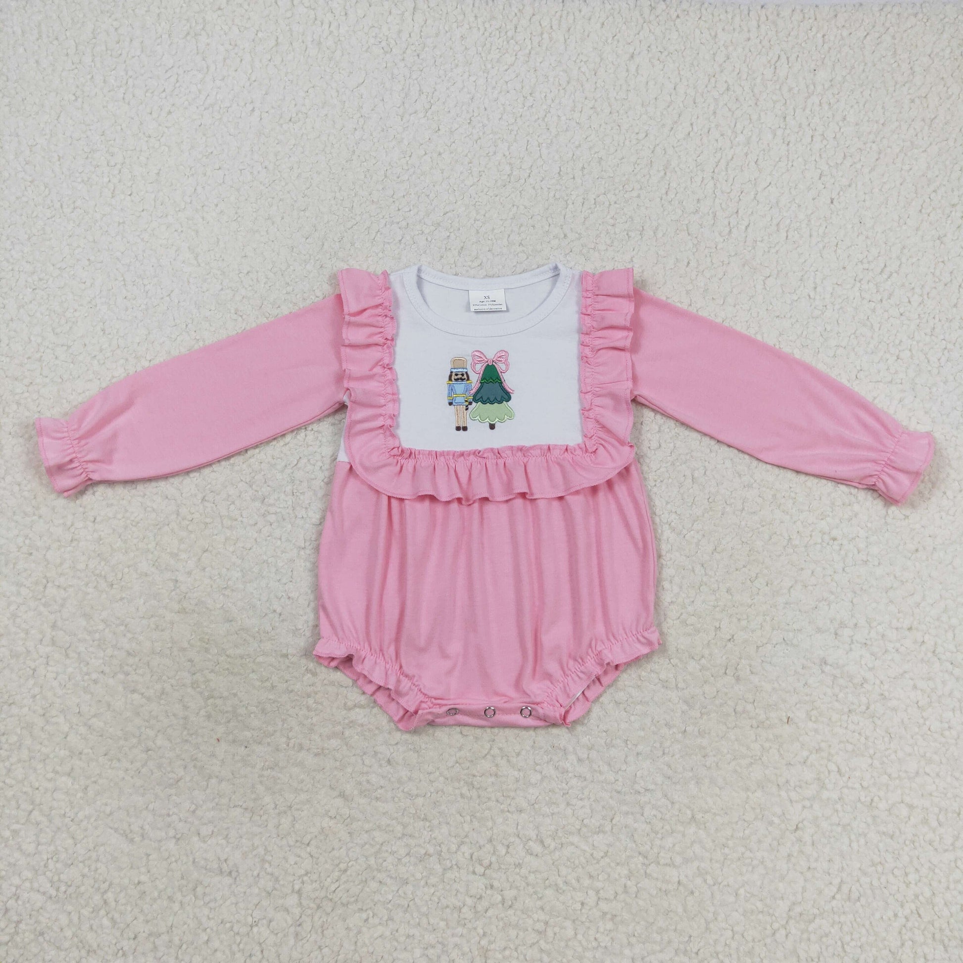LR0480 Baby Girl Long Sleeves Embroidery Soldier Christmas Pink One Piece Romper