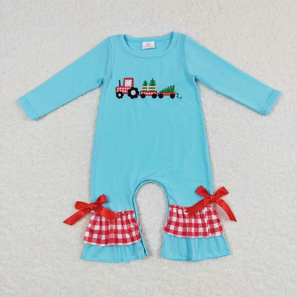 LR0500 Baby Boy Long Sleeves Christmas Embroidery Truck Tree One Piece Romper