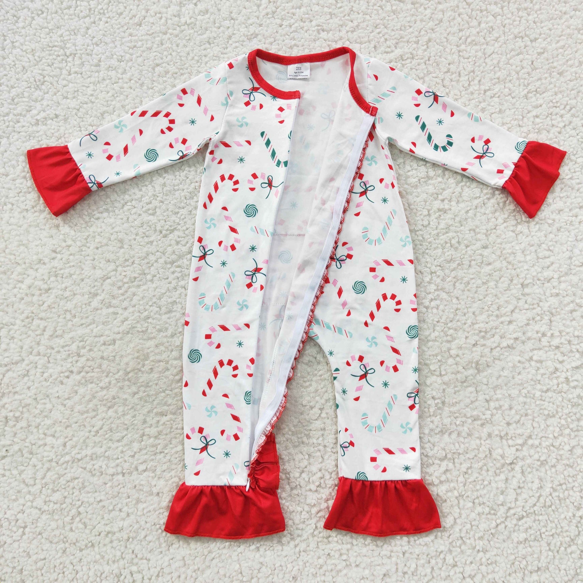 LR0501 Baby Girl Long Sleeves Christmas Candy Cane One Piece Romper