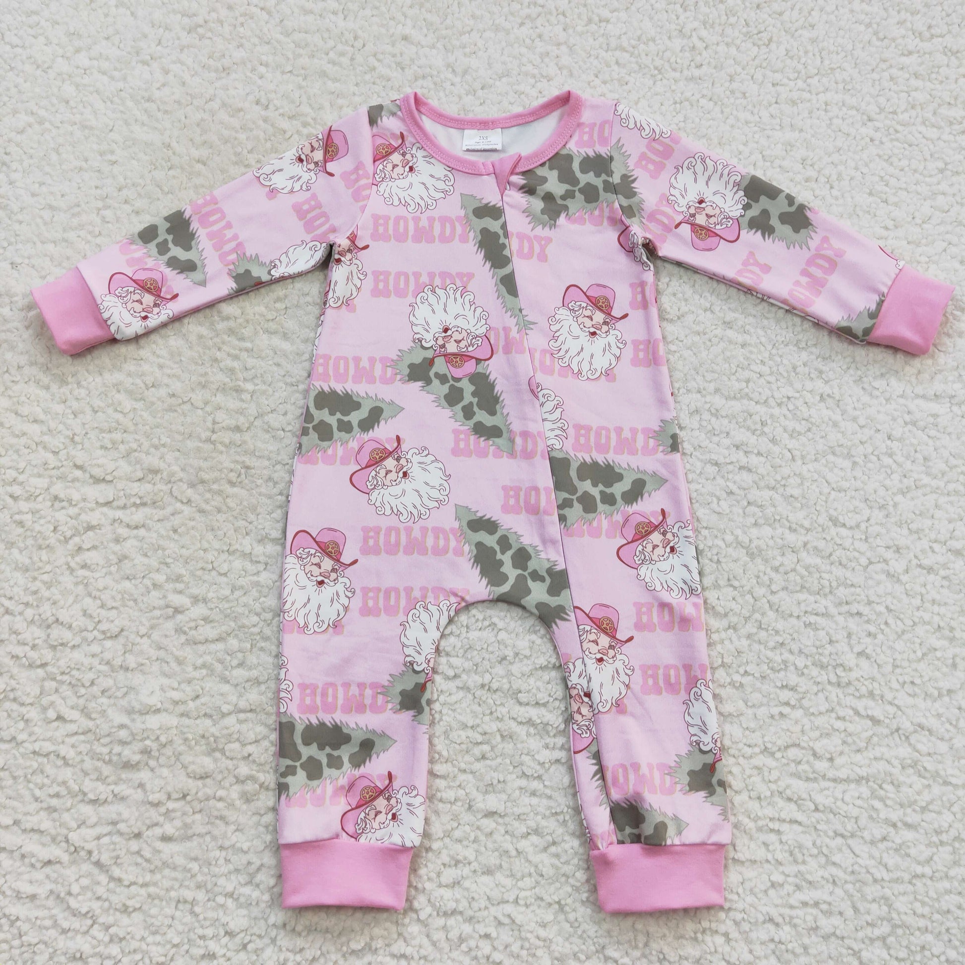 LR0548 Baby Girl Christmas Santa Howdy Long Sleeves Pink One Piece Zipper Footie Romper
