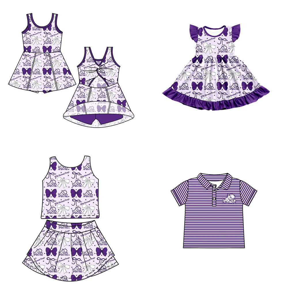 ( Moq 5 each style ) Baby Boy Girl Toddler Team Purple Bows Sibling Shirt Dress Set 6.23