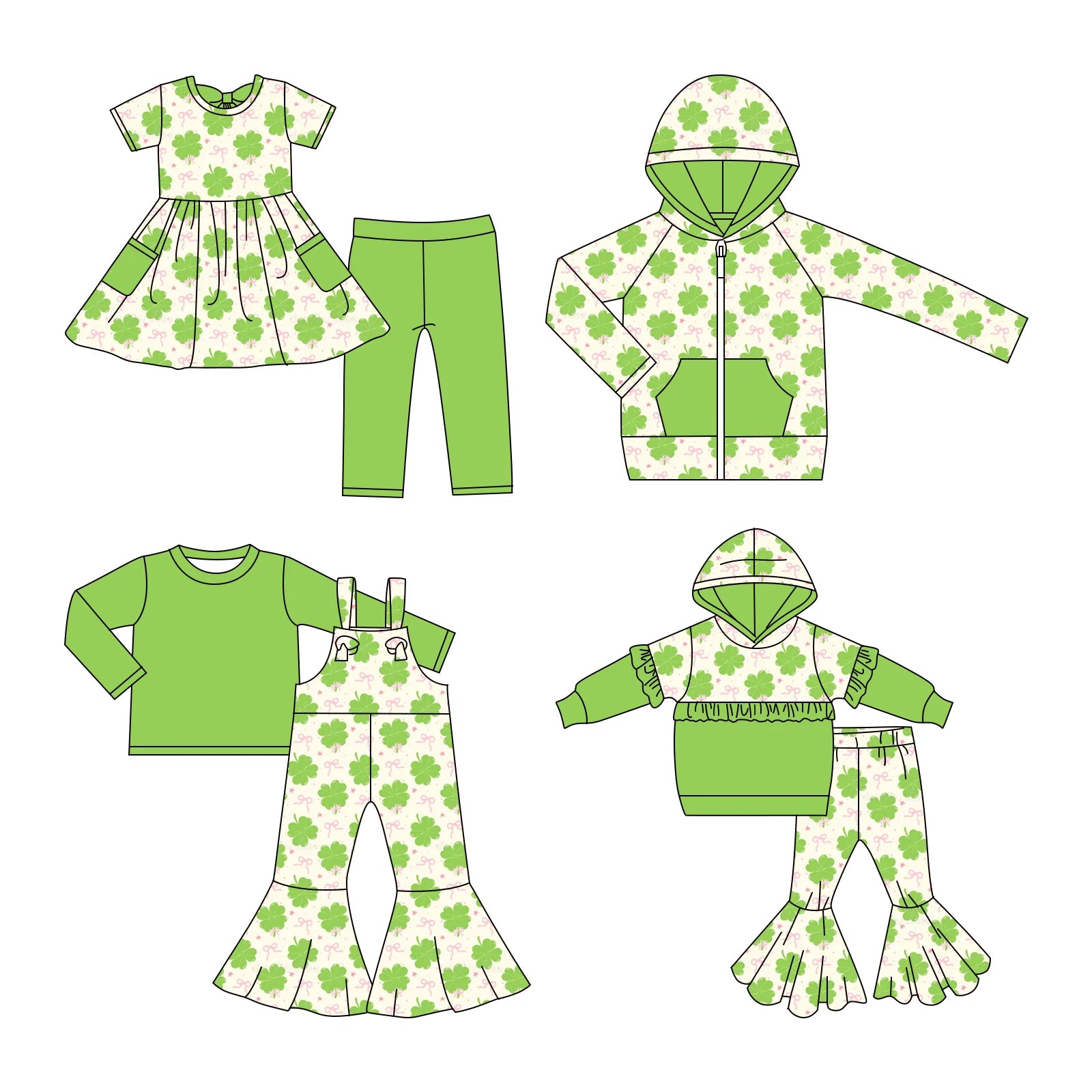 ( Moq 5 Each Style ) Baby Girls Clovers Bows St. Patrick's Day Sibling Green Hoodie Shirt Sets