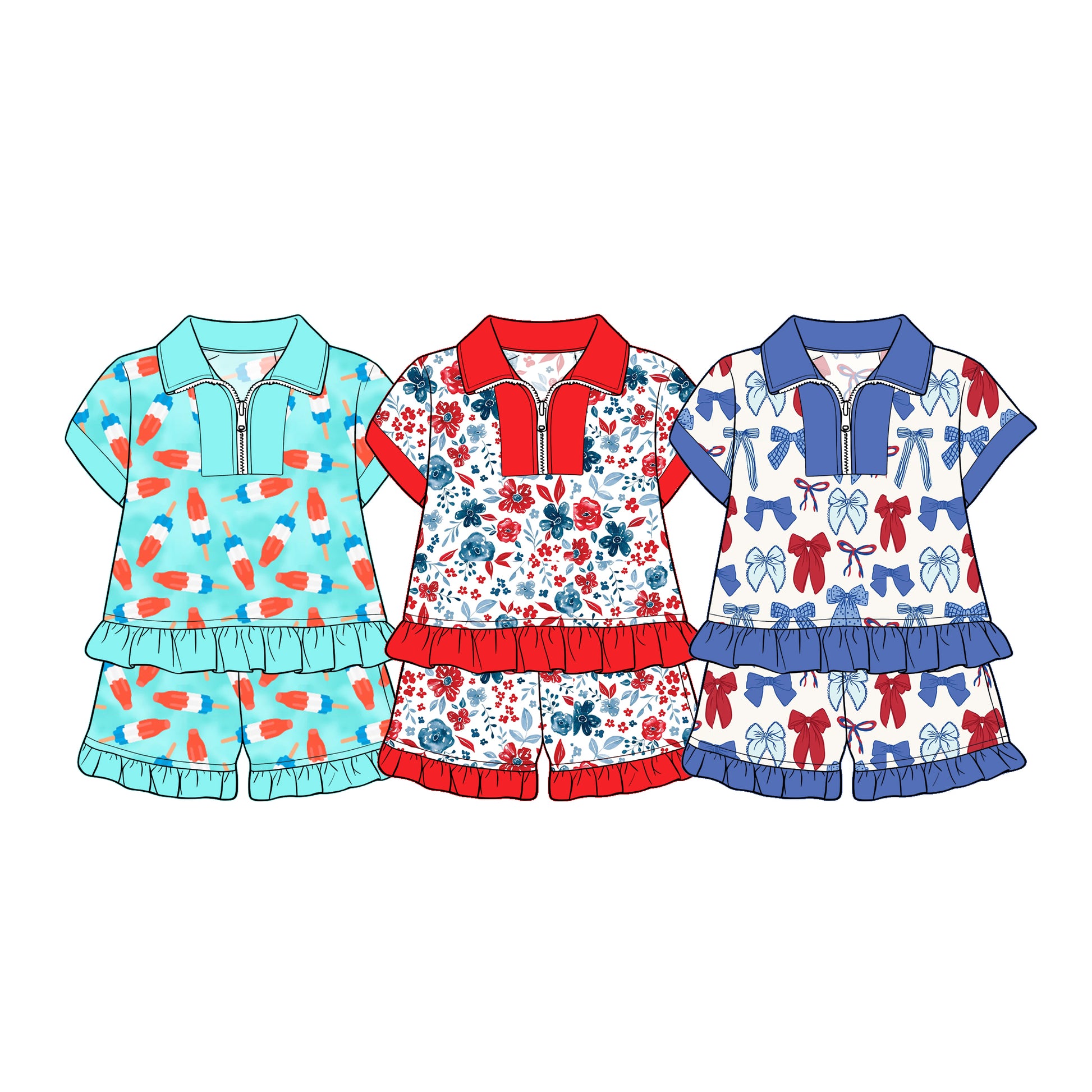 ( Moq 5 Each Style ) Sibling Baby Girls Kids Short Sleeves Zipper Shirt Shorts Sets 4th of July Clothes