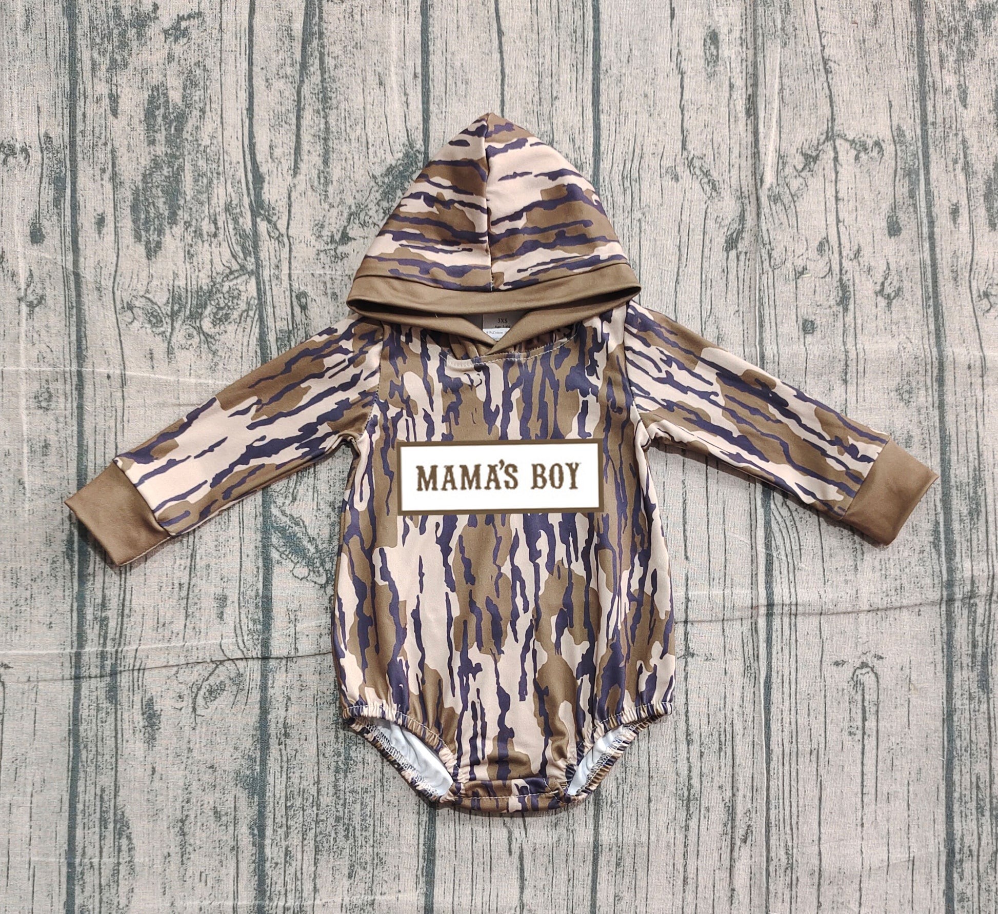 ( No moq ) Preorder Baby Boys Long Sleeves Embroidery Mama's Boy Hoodie Camo Brown Bubble Romper
