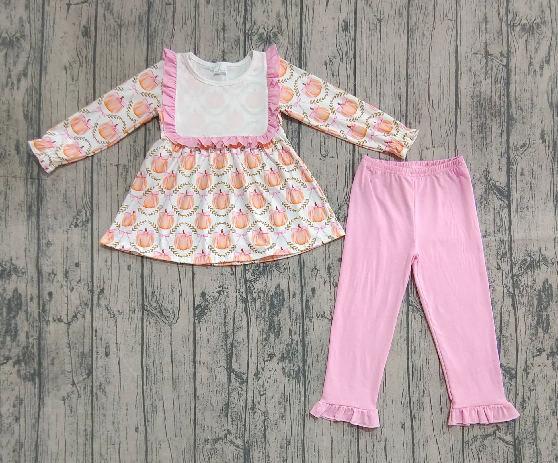 ( No moq ) Preorder Baby Girl Long Sleeves Pumpkin Bows Tunic Pink Pants Set RTS