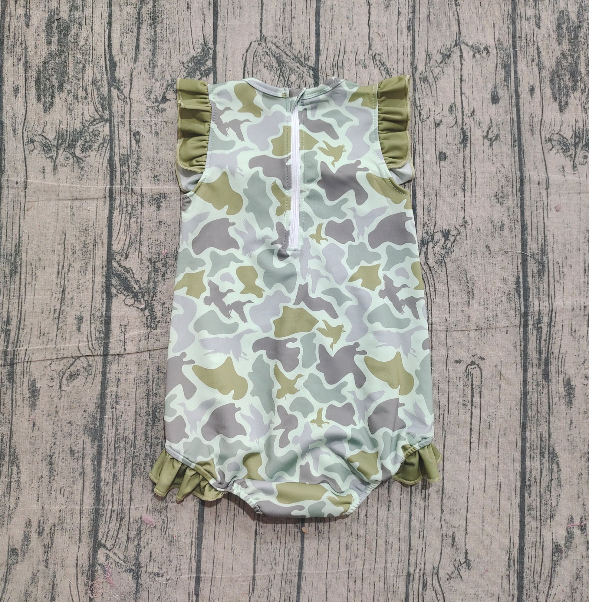 ( No moq ) Preorder Baby Girls Ducks Camo Green Ruffle One-piece Swimsuit