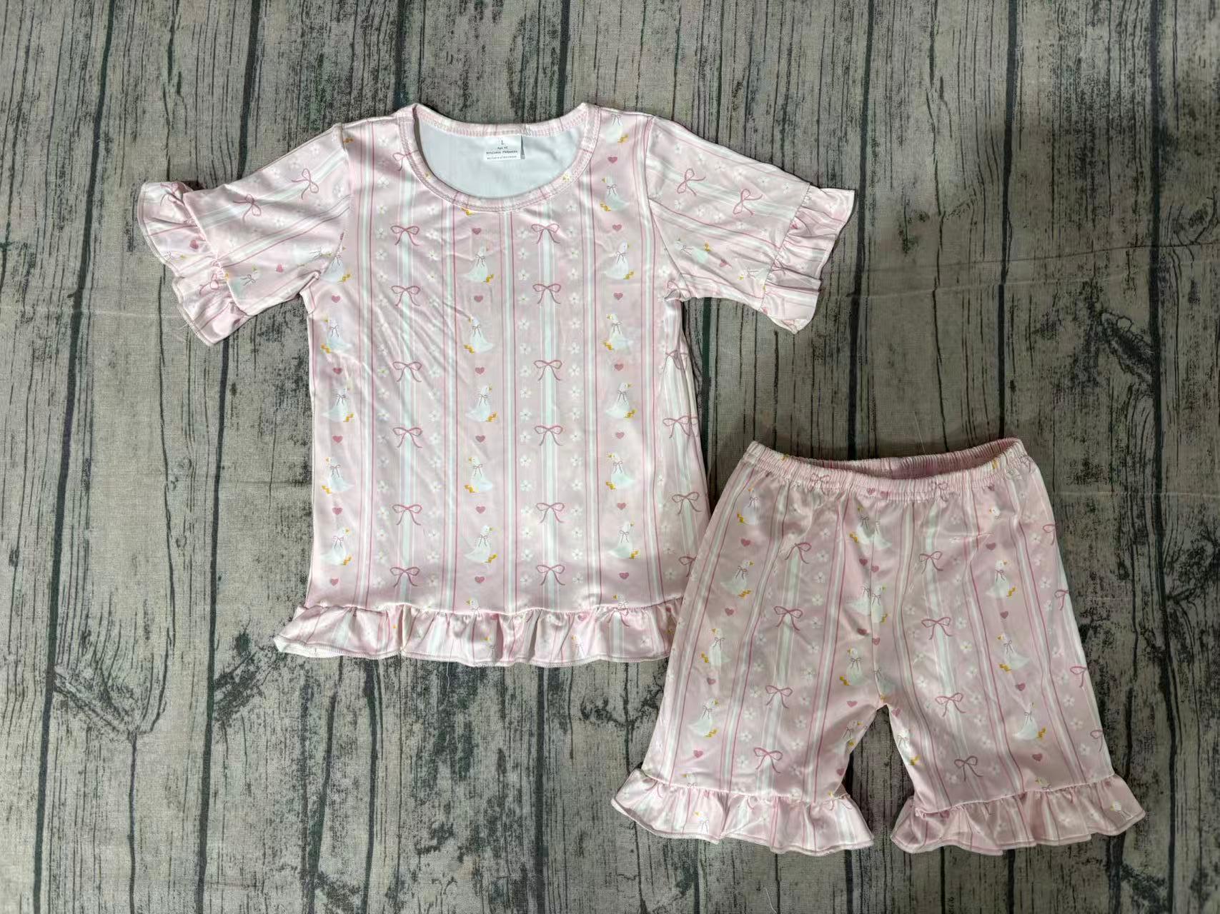 ( No moq ) Preorder Baby Girls Kids Short Sleeves Goose Bows Hearts Flower Shirt Shorts Summer Set