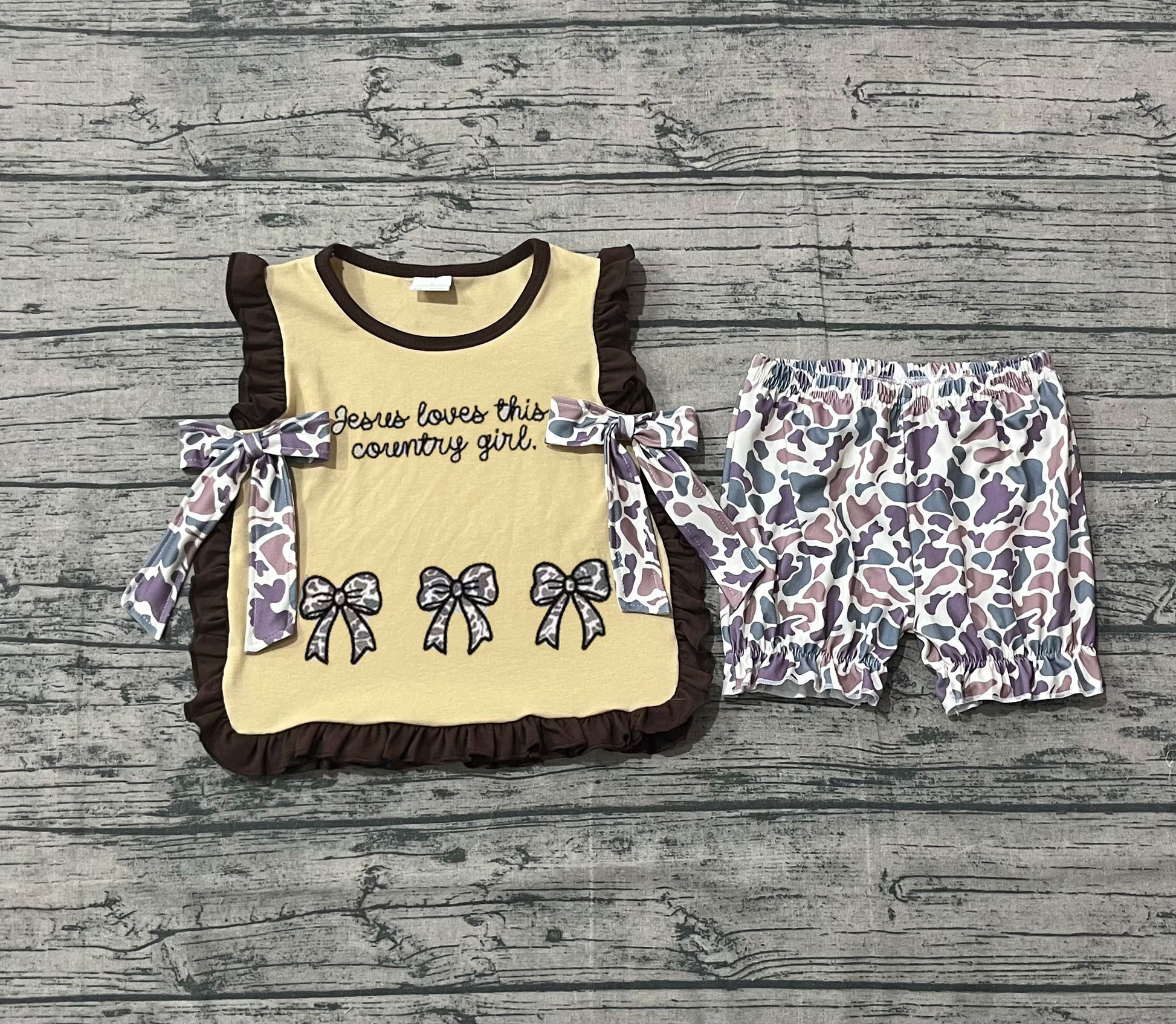 ( No moq ) Preorder Girls Kids Embroidery Jesus Love Me Bows Tops Camo Shorts Set
