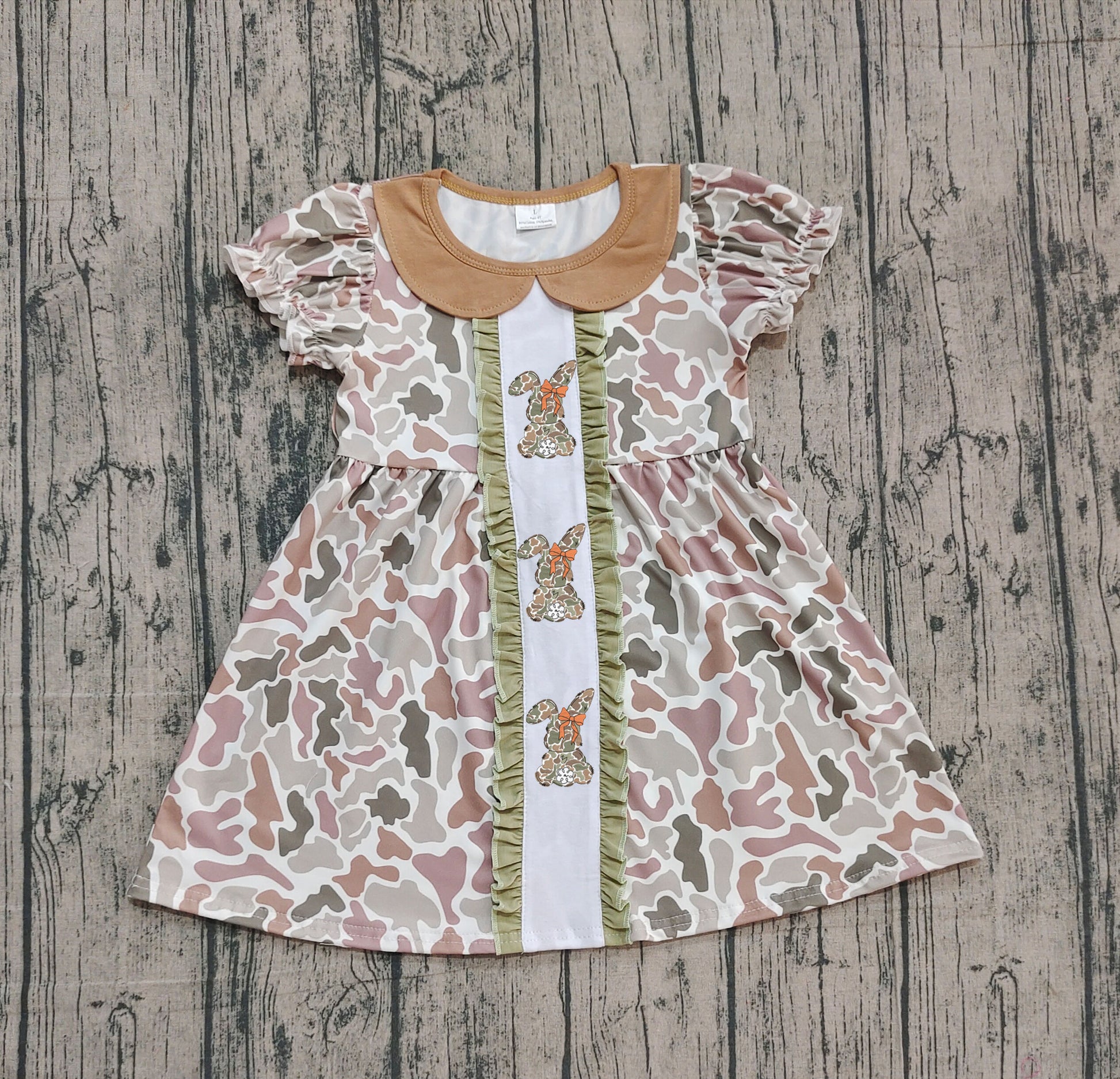 ( No moq ) Preorder Girls Kids Short Sleeves Embroidery Rabbits Bows Camo Easter Knee Length Dress